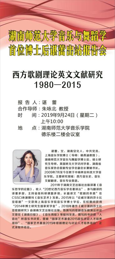 9月24日上午,湖南师范大学音乐与舞蹈学首位博士后谌蕾出站报告会于德乐楼二楼会议室圆满举行。此次是音乐与舞蹈学博士后流动站首位博士后出站报告会,因此各部门领导都非常重视,省人社厅专家服务中心(博士后管理办公室)宁登科主任、喻晔科长,湖南师范大学人事处邓正付副处长、博管办欧月娥秘书,音乐学院罗嵘书记、廖勇院长出席了报告会。