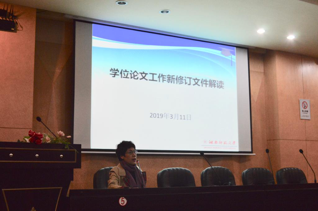 此次会议由党委书记罗嵘主讲。罗嵘讲到学校对进一步规范研究生学位论文做了新的部署和新的要求。此次改革的背景有两点,第一是教育部连续出台了相关文件,第二,学术学工道德和学位论文质量受到广泛关注,学术不端行为的惩戒首次进入了政府工作报告。罗嵘还着重讲解了学校近期颁布的文件《湖南师范大学关于对研究生学位论文进行查重检测的实施办法》,《湖南师范大学研究生学位论文评阅办法》和《博士硕士学位论文抽检办法》。讲述了改革的做法和原则,其修订原则为提高论文质量,规范过程管理,强化导师职责。