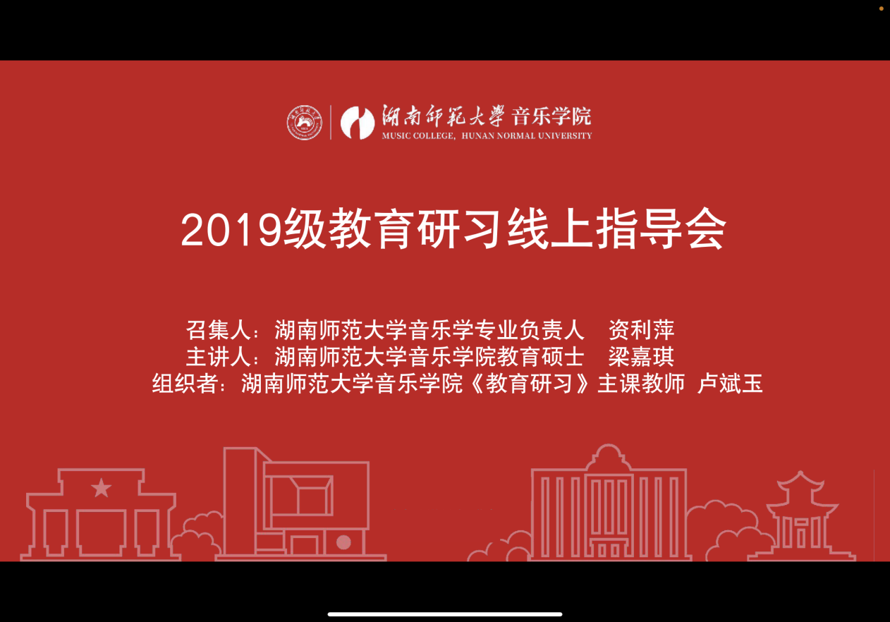 为更有效地开展2019级音乐学(师范)专业教育研习工作,音乐学院于12月16日中午以线上会议的方式召开了2019级教育研习线上指导会,会议召集人为音乐学专业负责人资利萍副院长,主讲者为学科教学(音乐)方向研究生梁嘉琪同学,组织者为《教育研习》主课教师卢斌玉老师。会议由音乐学专业负责人资利萍副院长主持,2019级音乐学专业全体同学参加会议。