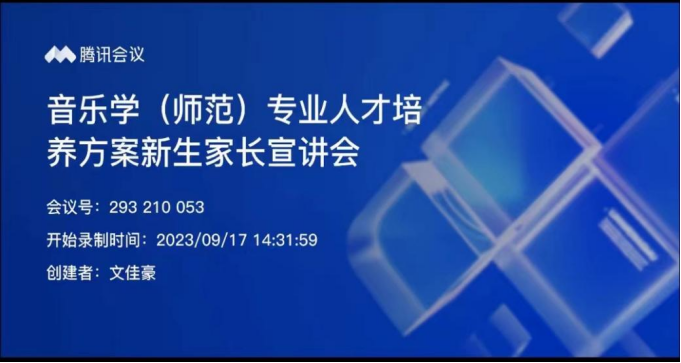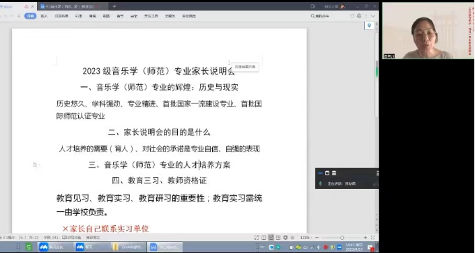 (通讯员 罗今吟)为更好宣传音乐学(师范)专业人才培养方案,9月17日下午,音乐学院以线上会议的形式召开了音乐学(师范)专业人才培养方案新生家长宣传会。会议由音乐学(师范)专业负责人资利萍副院长主讲,2023级辅导员文佳豪主持,79位新生家长参加会议。