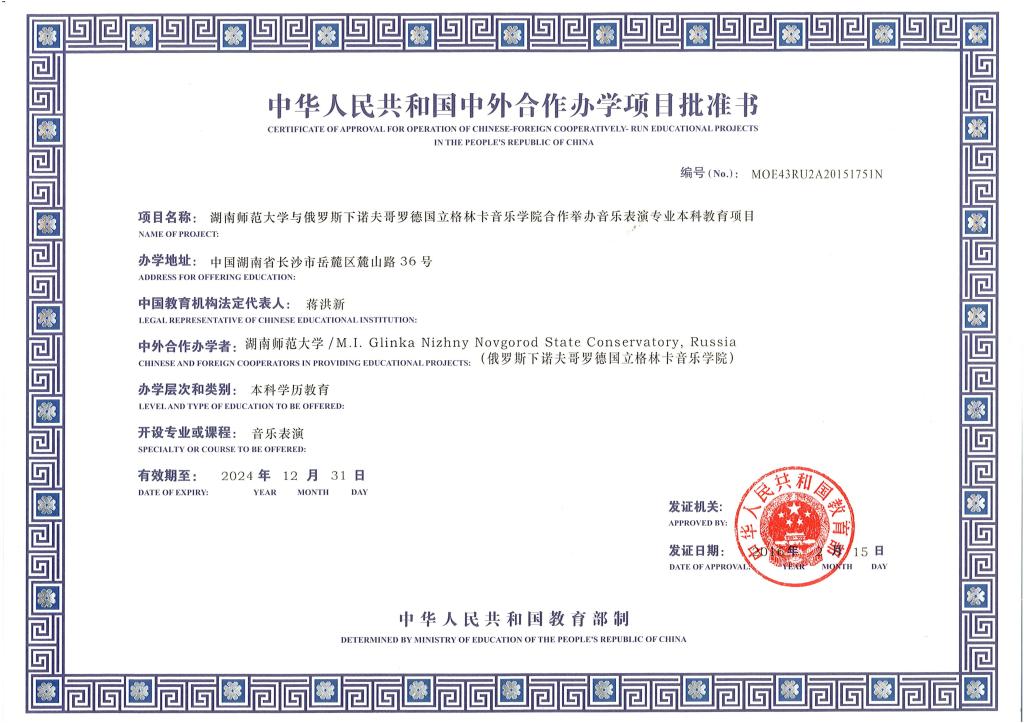 近日,根据《教育部关于公布2015年下半年中外合作办学项目审批结果的通知》(教外函[2016] 12号),我校申报的与俄罗斯下诺夫哥罗德国立格林卡音乐学院合作举办音乐表演专业本科教育项目获得批准,将纳入国家普通高等学校招生计划,招生起止年份为2016年至2020年,每年招生1期,每期招生人数不超过120人。据悉,本次教育部共审批通过本科以上中外合作办学项目共25个。