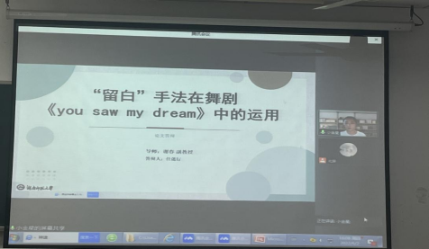 任懿行的论文题目为《“留白”手法在原创舞剧<you saw my dream>中的运用》,从研究缘起、研究现状、研究内容、研究结论逐一阐述了何为“留白”,“留白”在其他艺术领域如何存在,并结合舞蹈的特性,从动作、构图、调度、音乐、舞美等方面阐述了“留白”手法多维度多角度的与其舞剧相结合,且提出具有一定价值的创新性观点。陈鸿老师充分肯定了懿行同学创作具有一定的风格与特点,提出舞蹈创作应是美与丑相结合,该同学用舞蹈的表现形式将花、鸟、鱼具体的画作形态呈现于舞台,将变形的美与丑相结合,使舞蹈创作更具有真实感。吴兰老师认为懿行同学论文的内容及思路完整清晰,并指出“留白”这一观点在书法、绘画与舞蹈中的阐释与运用应再进一步深入研究。