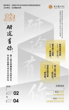 为凝聚全国舞蹈研究生人才培养力量,汇聚展示舞蹈高层次人才培养成果,扩大舞蹈高等教育行业影响力,在全国艺术专业学位研究生教育指导委员会的支持下,由北京舞蹈学院主办“研途有你”第二届全国舞蹈专业研究生毕业作品展与学术交流论坛于7月2日至4日进行线上展播。此次毕业作品展与学术交流论坛以专业型、学术型的研究生培养类型为划分,秉承“展成果、立人才、树形象、促交流”的宗旨,彰显新时代研究生勇于创新、敢于实践、勤于思考的热忱,激发舞蹈高校育人活力,切实提升研究生培养质量。