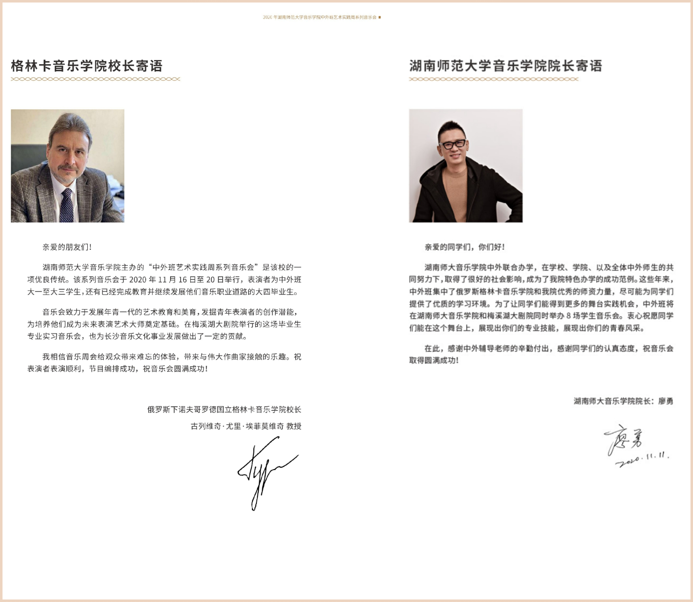 本次活动受到我校和下诺夫哥罗德国立格林卡音乐学院双方领导的高度重视,演出前我院廖勇院长和下诺夫哥罗德国立格林卡音乐学院校长古列维奇·尤里·埃菲莫维奇为本次活动题词,对全体演职人员寄以深切厚望。
