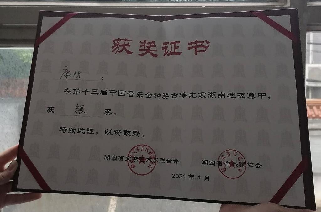 (供稿 吴楠子)第十三届中国音乐金钟奖古筝比赛湖南选拔赛,于2021年4月18日在邵阳学院顺利落下帷幕。湖南师范大学音乐学院康玥同学在本次比赛中荣获银奖。