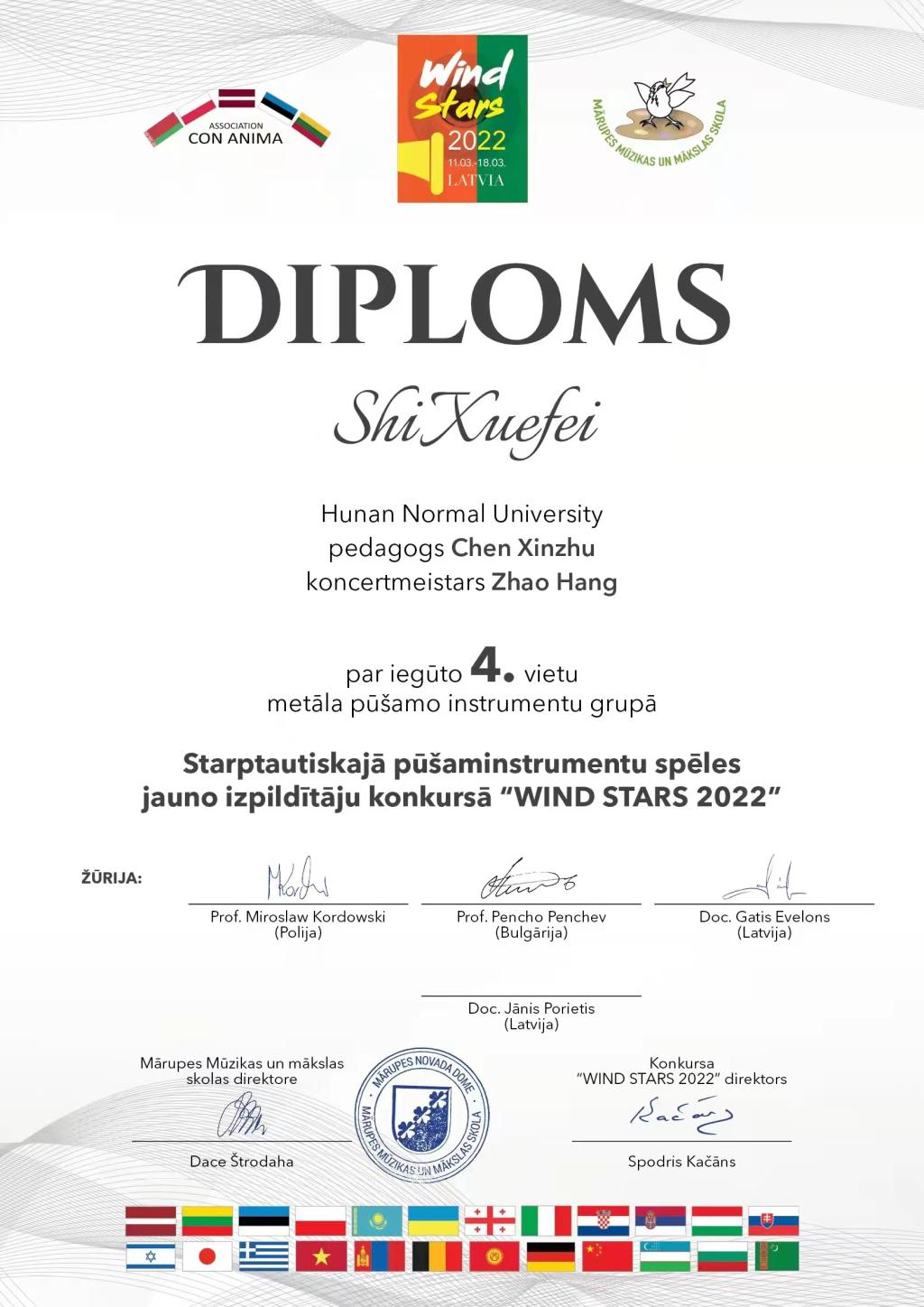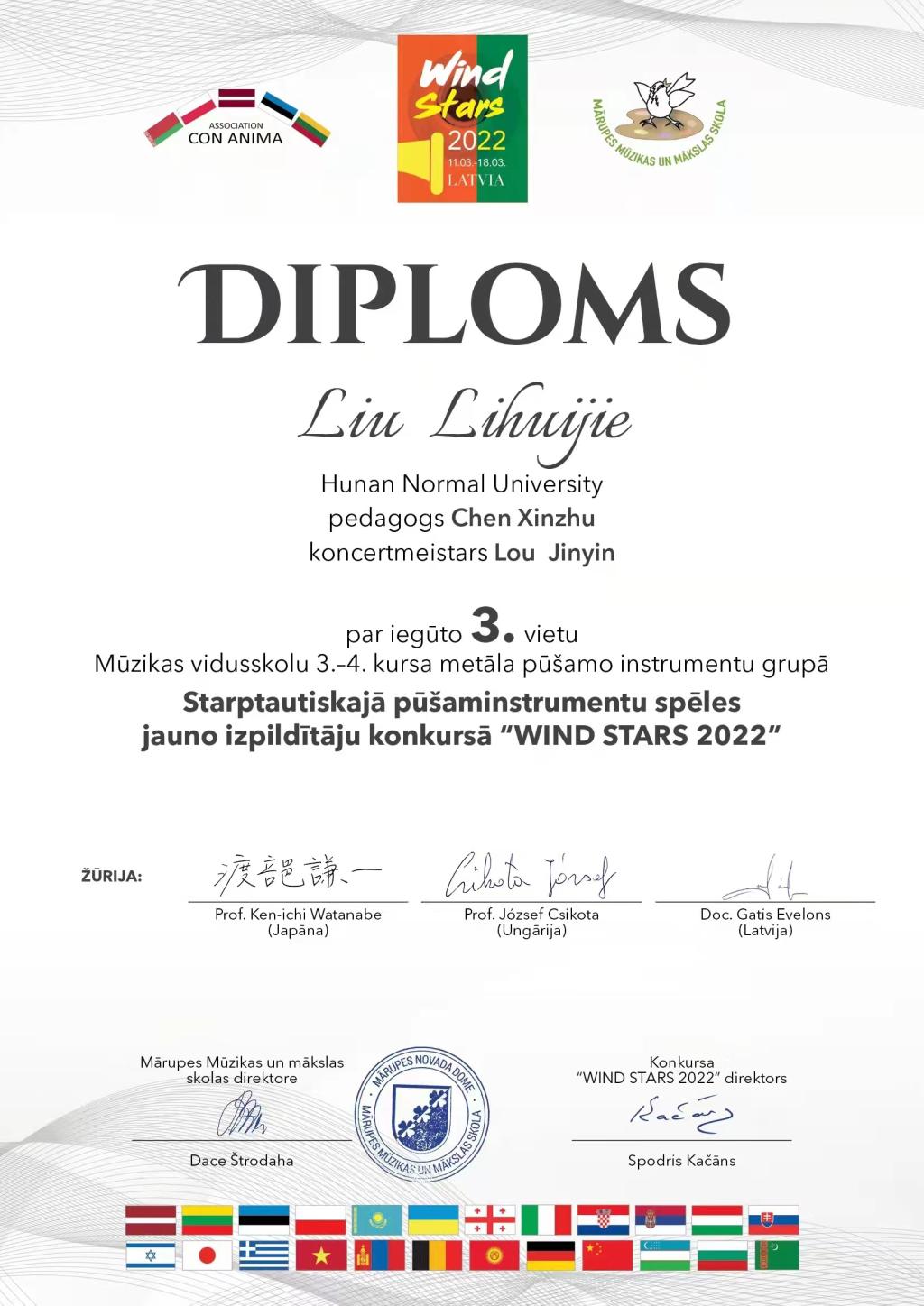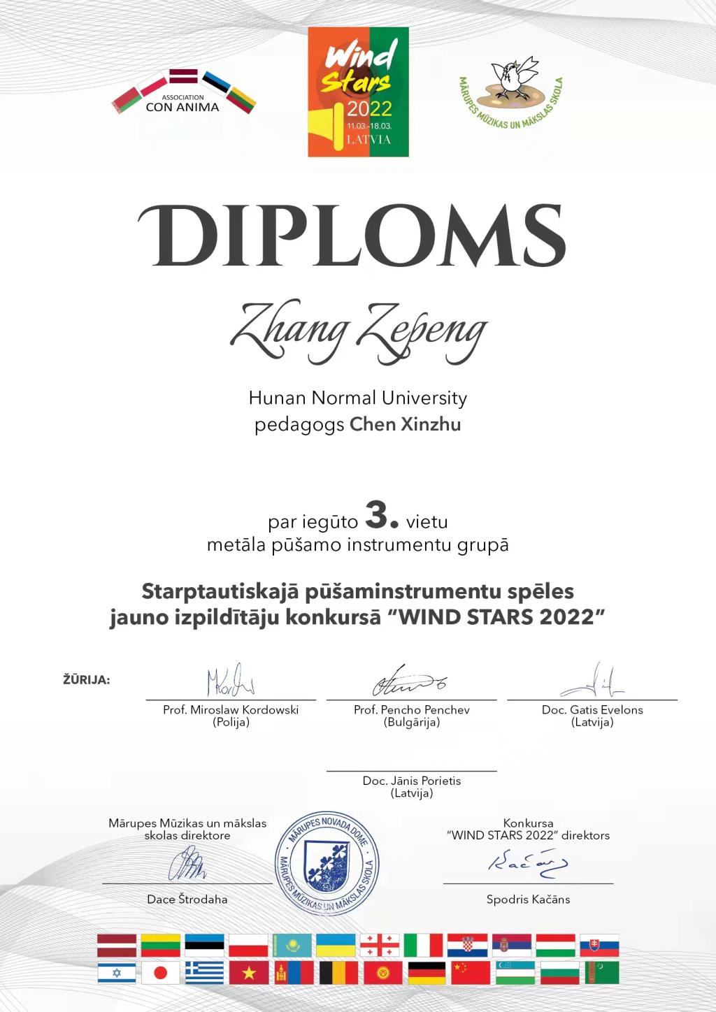 2022年第三届管乐器与打击乐器国际青年演奏家比赛“风之星2022”(“WIND STARS 2022”),于3月26日正式落下帷幕。在这次比赛中,湖南师范大学音乐学院本科2018级音乐学专业学生丁仕博、张泽鹏两位同学荣获独奏B2组三等奖,本科2021级音乐表演(中外合作办学)专业学生刘李慧杰荣获独奏B1组三等奖,本科2018级音乐表演(中外合作办学)专业学生史学飞荣获独奏B2组四等奖,本次获奖的本科生皆师从我院陈薪竹老师。