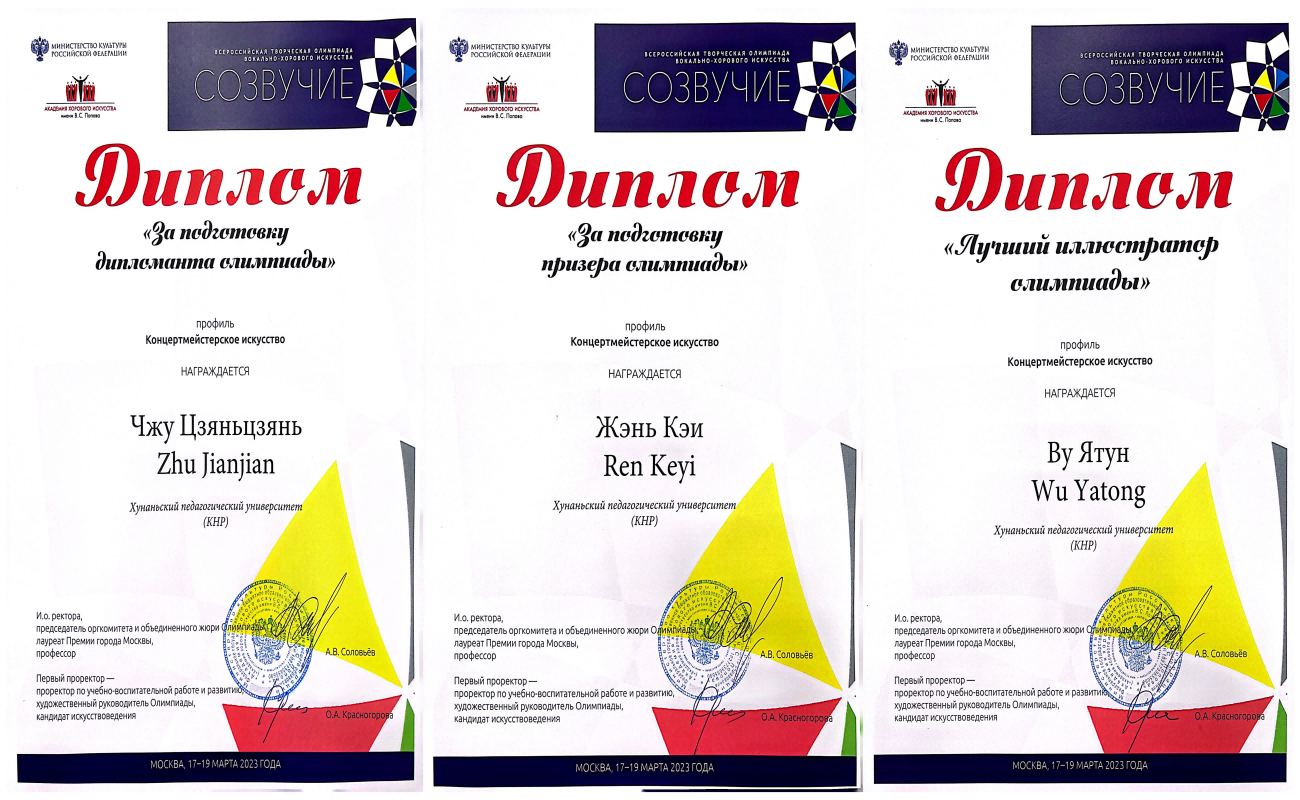 2023年第八届全俄声乐合唱艺术奥林匹克竞赛于3月19日正式落下帷幕。在这次比赛中,我院本科2021级音乐表演专业贺良坤同学荣获三等奖,2021、2022级音乐表演(中外合作办学)专业张嘉懿、姜函妤两位同学荣获优胜奖。本科2021级音乐表演(中外合作办学)专业吴亚桐同学担任此次艺术指导方向比赛的声乐伴唱,表现优异。指导老师朱坚坚、任珂漪获优秀指导老师奖。