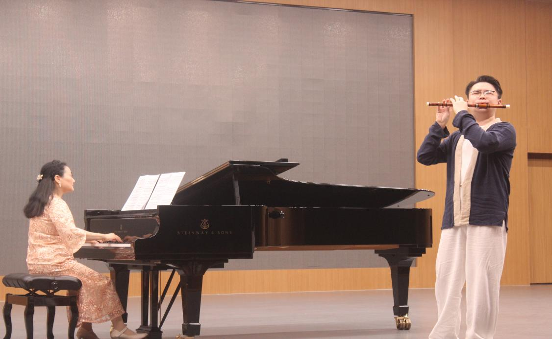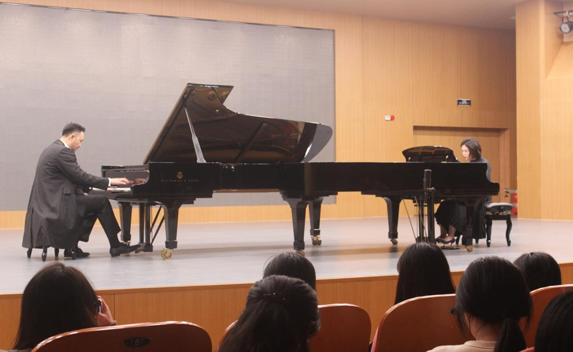 音乐会领衔演奏的是匡勇胜教授,他演奏了自己原创的钢琴协奏曲《中国速度》第一乐章《旷野》,向坤协奏。青年教师周婧佳老师、冯时雨老师、陈浩然老师们的演奏充分展示了音乐学院青年教师良好的精神风貌和优秀的专业素养。两位外籍教授薇拉·沃萝希洛娃及伊利亚·索洛维耶夫以他们高超的演奏技巧和深厚的音乐造诣献上了他们的拿手曲目。张浩教授与青年竹笛演奏家康睿阳老师带来的竹笛作品《绿洲》,他们默契娴熟地演奏,让观众们耳目一新。由巴日老师演奏,王琛琛老师协奏的贝多芬《第一钢琴协奏曲》Op 15第一乐章热烈激昂,将气氛推向高潮。最后,由杨琦老师和姜珊珊老师带来的双钢琴演奏为此次音乐会画上一个圆满的句号。相信余音绕梁一定是本次观众们深切的感受。