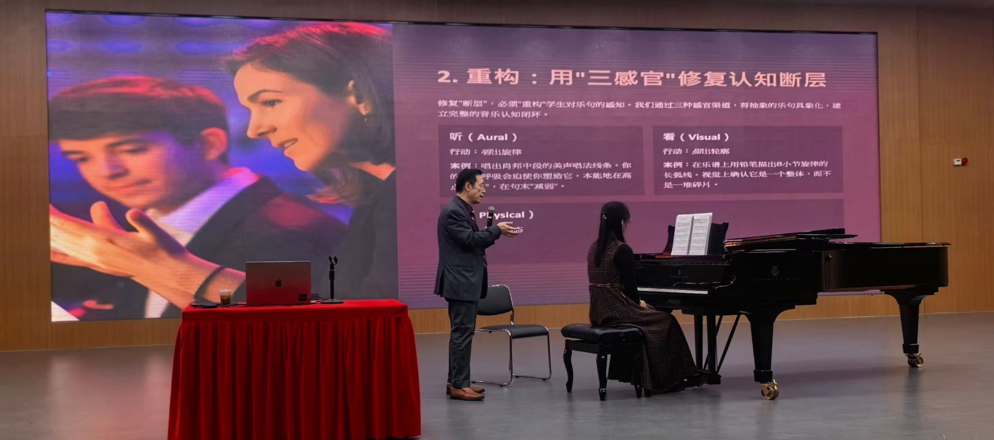 11月21日早九点,湖南师范大学音乐学院钢琴教研室在和乐楼四楼音乐厅以《穿越瓶颈:钢琴学习中的“断层”诊断与系统重构》为主题举办学术讲座,特邀美籍华裔钢琴家、音乐教育家卜劼教授主讲,聚焦钢琴学习瓶颈破解与国际教学理念交流,现场师生共探教学创新路径,钢琴系青年教师陈浩然主持此次讲座。