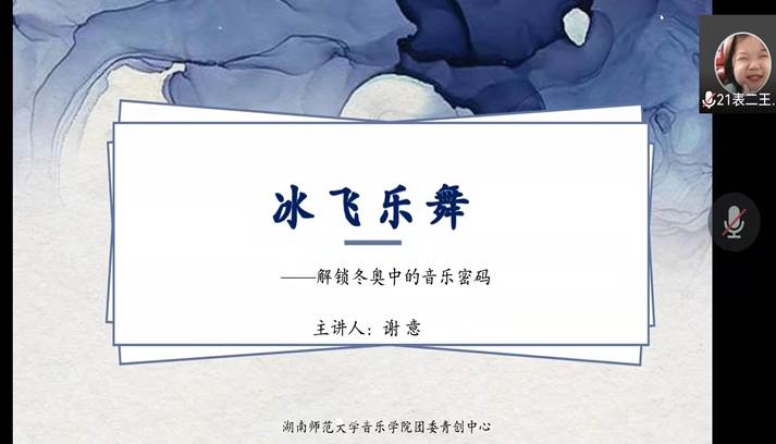 主讲人围绕“解锁冬奥中的音乐密码”这一主题,分别从“浪漫开幕式”、“经典作品赏析”、“一起向未来”三个方面展开。会议伊始,主讲人首先以此次冬奥会的吉祥物“冰墩墩”为线索导入此次课题,随后对冬奥会开幕式中音乐作品的背景进行了具体分析,带领同学们了解到音乐作品的创作背景。活动最后,赏析了西方音乐的经典代表作品,同学们在活动中探寻音乐之美,在潜移默化中提升了艺术鉴赏能力。