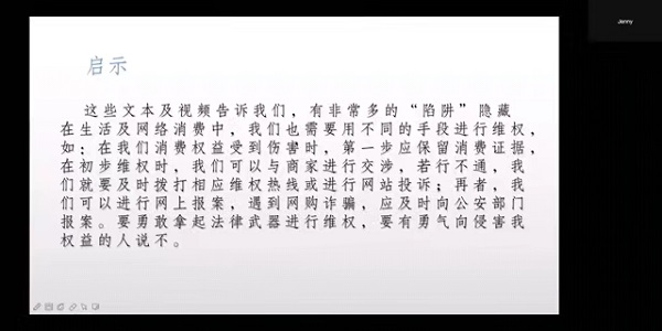 宣讲会展示了网络消费的相关背景,分享成功维权案例,并邀请了同学分享维权心得,同学们积极参与讨论,反响热烈。