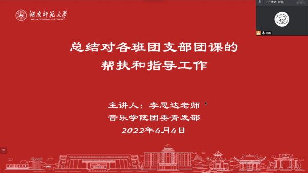 (通讯员 郑歆诺 刘雨 赵紫涵)2022年4月4日星期一,音乐学院通过线上腾讯会议召开对各班团支部团课帮扶和指导工作的总结会议。团委青发部负责人刘雨担任本次会议的主持人,团委负责人李思达老师担任主讲人。音乐学院各班组织委员与青发部干事共同参与。