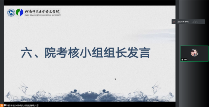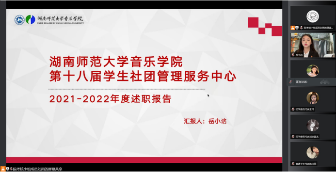 (通讯员 郑歆诺 刘雨 赵紫涵)4月8日中午,湖南师范大学音乐学院2021-2022年度二类学生干部述职考核大会通过线上腾讯会议召开。青发部负责人刘雨担任主持人。音乐学院党委书记罗嵘老师、研究生办主任牟洋老师、学工办主任、2021级辅导员陈芳老师、团委负责人、2018级辅导员李思达老师、2020级辅导员戴霁斌老师、2019级辅导员张行老师出席此次会议。
