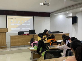 课程分为一节歌曲学唱课和一节艺术鉴赏课。第一节课,志愿者带领孩子们复习了歌曲《祖国的花朵》和《萱草花》,随后志愿者让孩子们通过肢体动作发出声响并与音乐相结合,通过不断练习,志愿者与孩子们协作完成了歌曲《孤勇者》的表演。第二节艺术鉴赏课,由我院华彩吉他社负责人进行授课讲解。通过课程,孩子们了解了吉他的构造与分类等知识,近距离观察与弹奏吉他,激发了孩子们对于吉他学习的兴趣。
