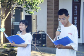 实践团成员代表郭牵心和学生代表曾祥广进行国旗下演讲