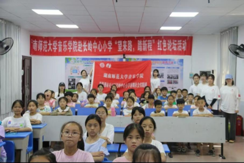 (通讯员 王可 周倩 刘睿)7月9日下午,我校音乐学院“追光计划”暑期社会实践团于株洲市天元区长岭中心小学开展“望来路,踏征程”主题红色论坛活动。此次宣讲会由实践团成员余秋蓉、盛美佳慧、李文清、杨奕锋主讲,学生参与人数共有63人。