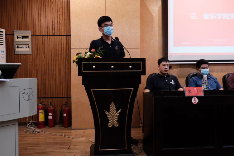 活动第一项全体起立,奏唱国歌。接着,活动第二项是由优秀党员代表研究生赵玥、本科生张紫馨两位同学上台发言,她们鼓励同学们要将奋斗目标与时代同频共振,且以坚定的理想谱写属于这个时代的靓丽五线谱,同时作为新时代的青年党员,应当有坚守初心的执着和心怀家国的担当,希望音院学子在学思践悟中坚定理想信念,在奋发有为中践行使命初心,在建设祖国的大熔炉里以奋斗姿态致敬最美青春。