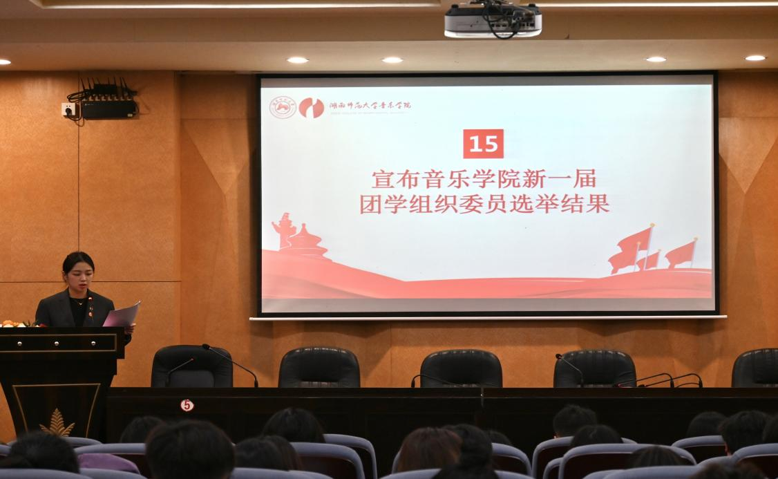 音乐学院学工办主任陈芳、2020级辅导员刘冀、2022级辅导员周子婳、2023级辅导员文佳豪及全体团员学生代表参加了此次大会。