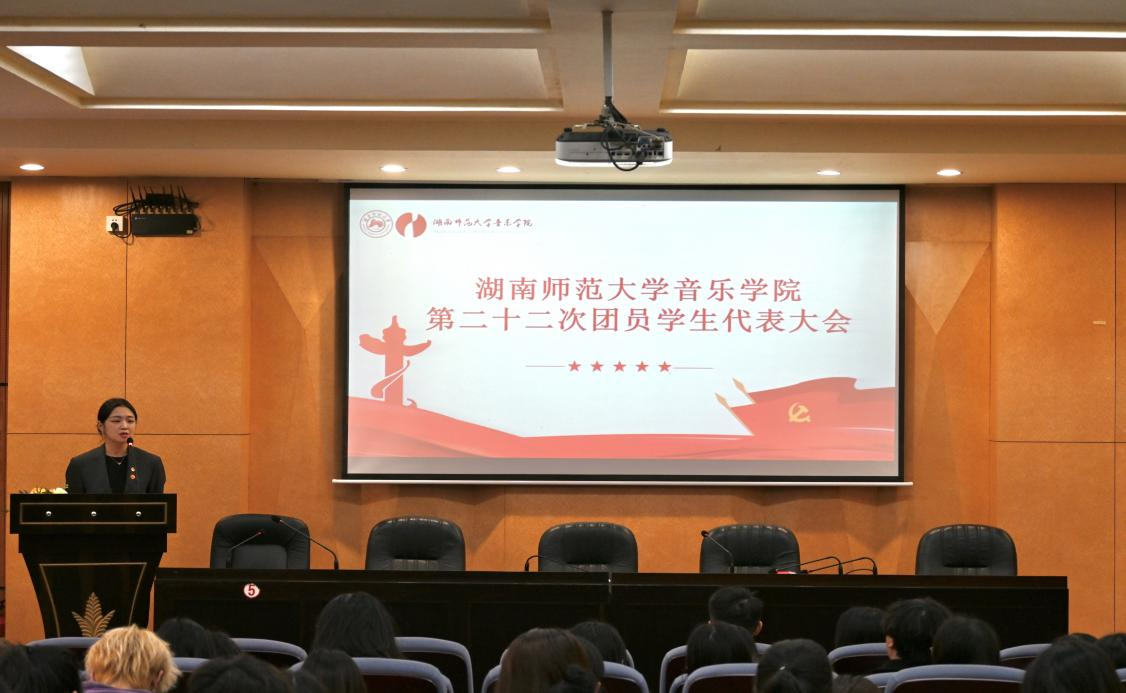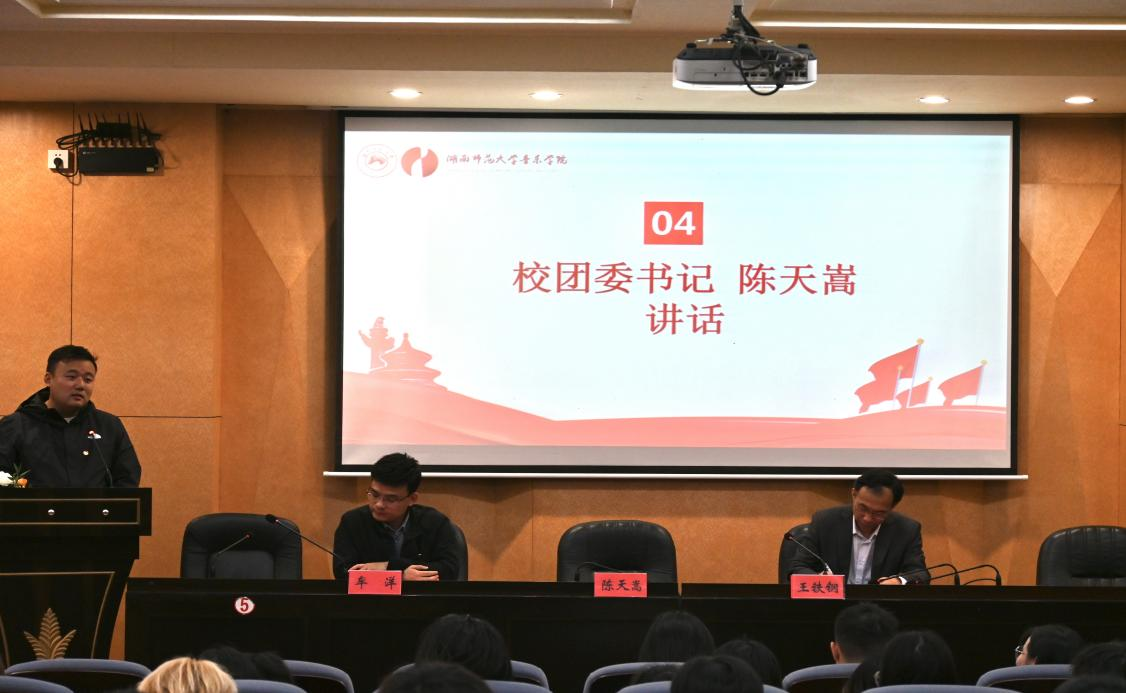 校团委书记陈天嵩讲话。他代表共青团湖南师范大学委员会对音乐学院第二十二次团员学生代表大会的顺利召开表示热烈祝贺,并充分肯定了音乐学院在校园文化建设、脱贫攻坚、乡村振兴的主战场上贡献的青春力量。最后,他寄语全体团员学生代表们要戒骄戒躁、脚踏实地,立足新时代、谋求新发展,努力成为担当民族复兴大任的时代新人。
