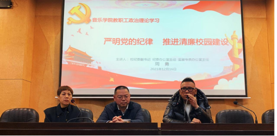 2021年12月16日下午,为落实学校清廉校园建设,创建清廉考点,音乐学院在和乐楼108报告厅召开清廉校园建设教职工政治理论学习会议。会上特别邀请了纪委副书记、监察专员办公室主任周勇主讲“严明党的纪律,推进清廉校园建设”。党委书记罗嵘主持会议,全体教职员工参加了学习。