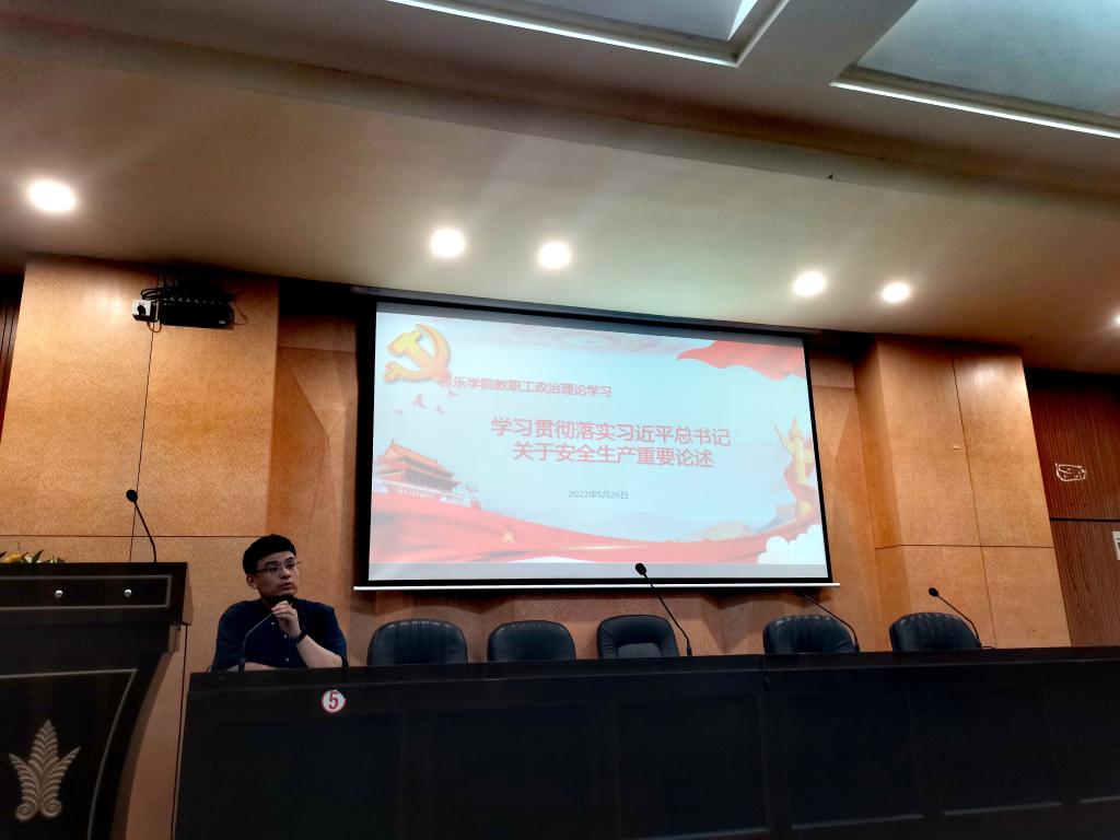 (通讯员:李紫菱)5月26日下午,音乐学院在和乐楼108教室召开全体教职员工政治理论学习会议。本次政治理论学习会的主题是学习贯彻落实习近平总书记关于安全生产重要论述,学院党委副书记牟洋主讲,全体教职员工和学生代表参与。