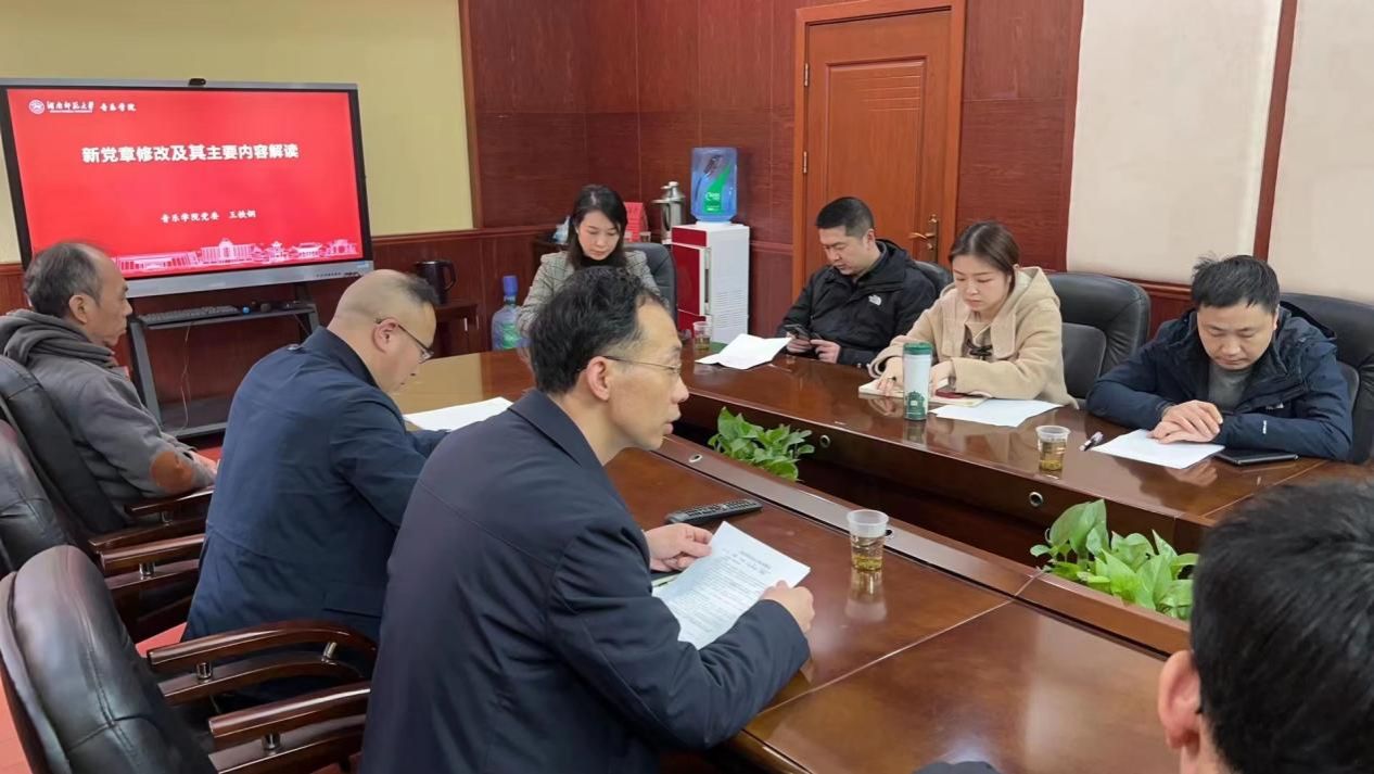 首先,他指出,党的根本大法是党章,党章是一个政党为实现党的纲领、开展正规活动、规定党的事务所规定的根本法规,是党赖以建立和活动的法规体系的基础,是党的各级组织和全体党员必须遵守的基本准则和规定。修改党章是深入学习巩固党的创新理论的需要、是推进党和国家事业发展的需要、是深入推进新时代党的建设新的伟大工程的需要、是贯彻落实党的二十大精神的需要。党的二十大通过的党章修正案,共修改50处,其中总纲部分的修改37处,条文部分的修改13处。接着,他对总纲部分特别重大的10个方面的修订进行了深入探讨和学习,对把“两个结合”这一马克思主义中国化时代化的规律性认识写入党章、充实完善习近平新时代中国特色社会主义思想的科学内涵和历史定位、增写党百年奋斗的重大成就和历史经验的内容、以中国式现代化全面推进中华民族伟大复兴的奋斗目标写入党章、把逐步实现全体人民共同富裕写入党章、分两步走的战略安排写入党章、把伟大建党精神写入党章、找到了自我革命这个跳出治乱兴衰历史周期率的第二个答案、把坚持新时代党的组织路线写入党章、坚定维护以习近平同志为核心的党中央权威和集中统一领导,这十个重大修订进行了一一解读。随后,他从四个方面阐述了如何遵守党章。一是要强化政治意识,深刻领悟“两个确立”的决定性意义;二是要强化规矩意识,严格用党章规范言行,做忠诚履职的表率;三是要强化修身意识,彰显党员干部的人格力量,做崇德向上的表率;四是要强化担当意识,发挥党员的先锋模范作用,做干事创业的表率。