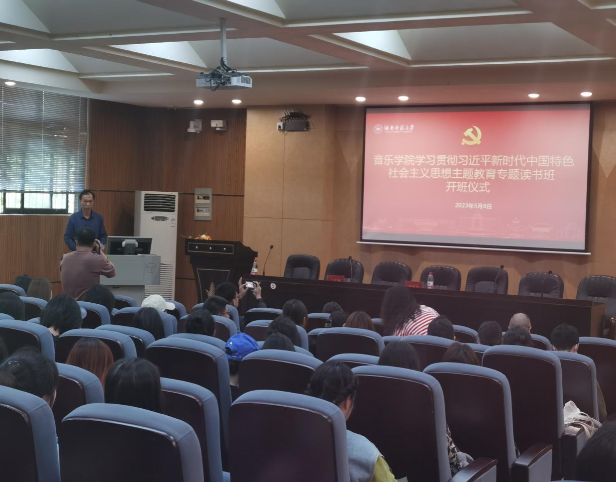 5月8日下午,音乐学院在和乐楼108教室举行学习贯彻习近平新时代中国特色社会主义思想主题教育读书班开班仪式。学院党委书记王铁钢主持开班仪式,并做了题为“全面深入学习习近平新时代中国特色社会主义思想 推动学院发展取得新成效”的动员报告。学院师生党员、入党积极分子、发展对象等参加开班仪式。
