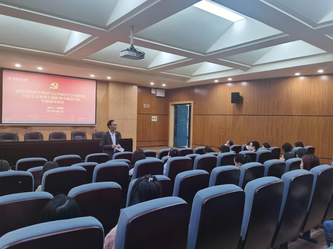 (通讯员 易泽英)5月11日下午,音乐学院学习贯彻习近平新时代中国特色社会主义思想主题教育专题读书班举行第三场辅导报告,学院党委书记王铁钢作主题为“深刻领悟‘两个结合’的重大意义与实践价值”的分享报告。主题教育读书班全体成员、教师第二支部(音乐表演)全体党员参加学习。