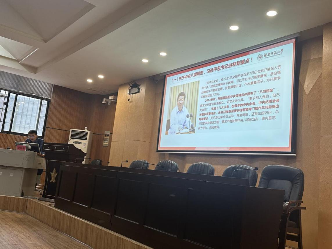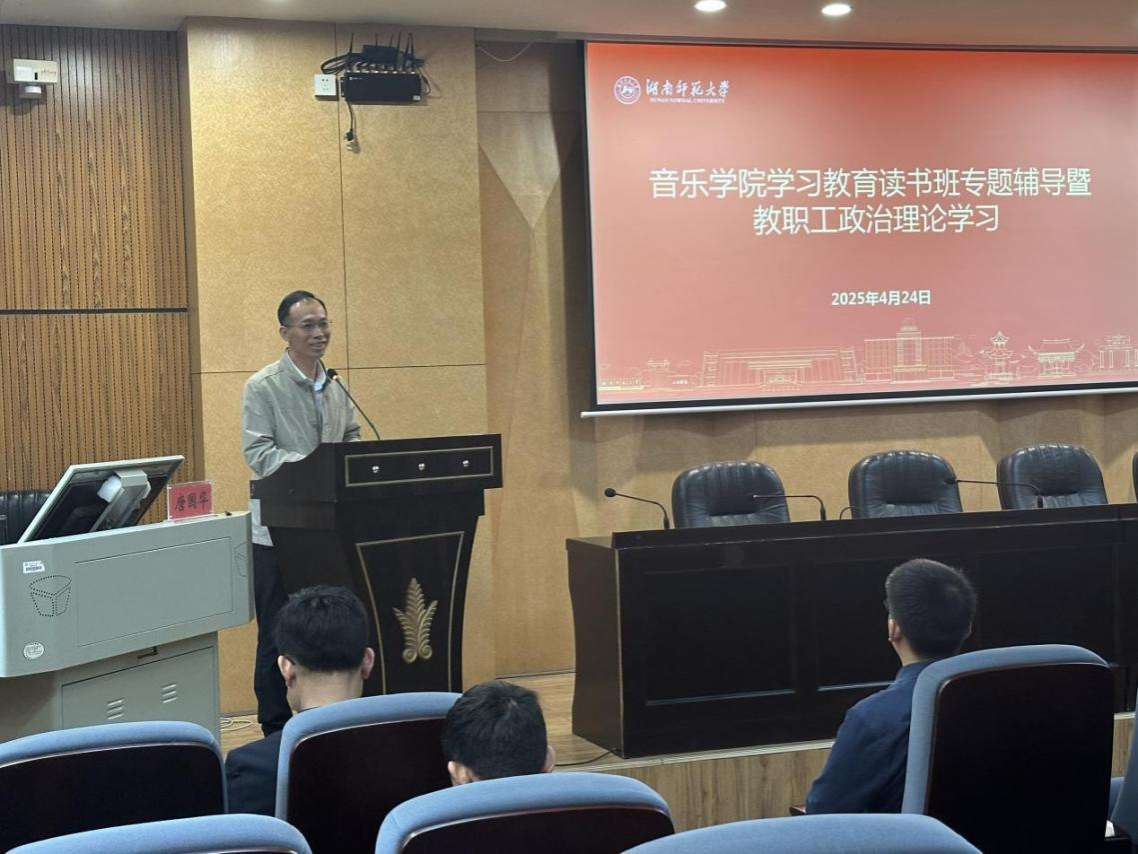 (通讯员:周宇时)2025年4月24日,音乐学院在和乐楼108举行深入贯彻中央八项规定精神学习教育读书班专题辅导暨教职工政治理论学习,校纪委原副主任、数据与信息化建设管理处副处长唐国华作题为“深入贯彻中央八项规定精神,以作风建设新成效保障学校高质量发展”专题报告,学院党委书记王铁钢主持会议,读书班全体成员及教职工参加学习。