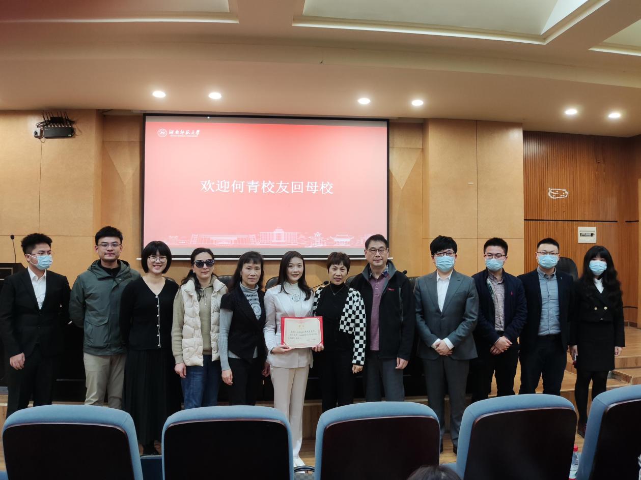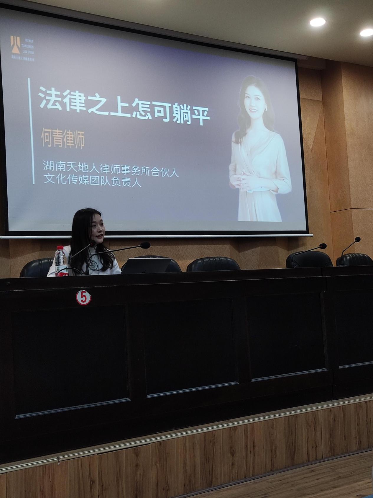 讲座开始前,院党委书记罗嵘老师致欢迎辞并为何青校友颁发法律顾问聘任证书,关工委常务副主任吴少敏老师介绍了何青律师团队及其工作经历。何青毕业于湖南师范大学音乐学院舞蹈系,毕业后自考了律师证。直至如今,她在法律行业中已取得了斐然的成绩。为加强社会主义法治文化建设,深入开展法治宣传教育,何青及其律师团队回到了母校。讲座由学工办主任陈芳老师主持。