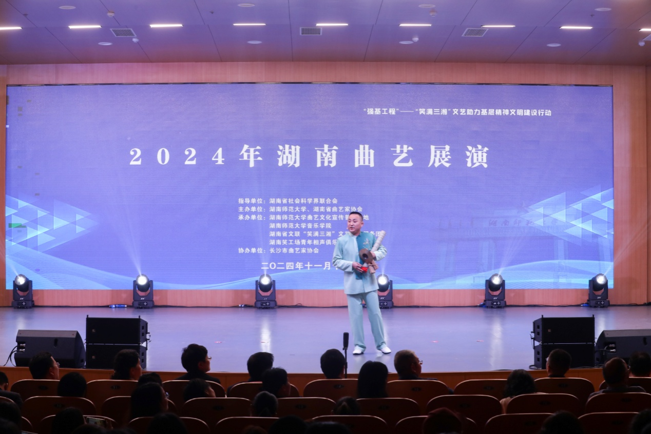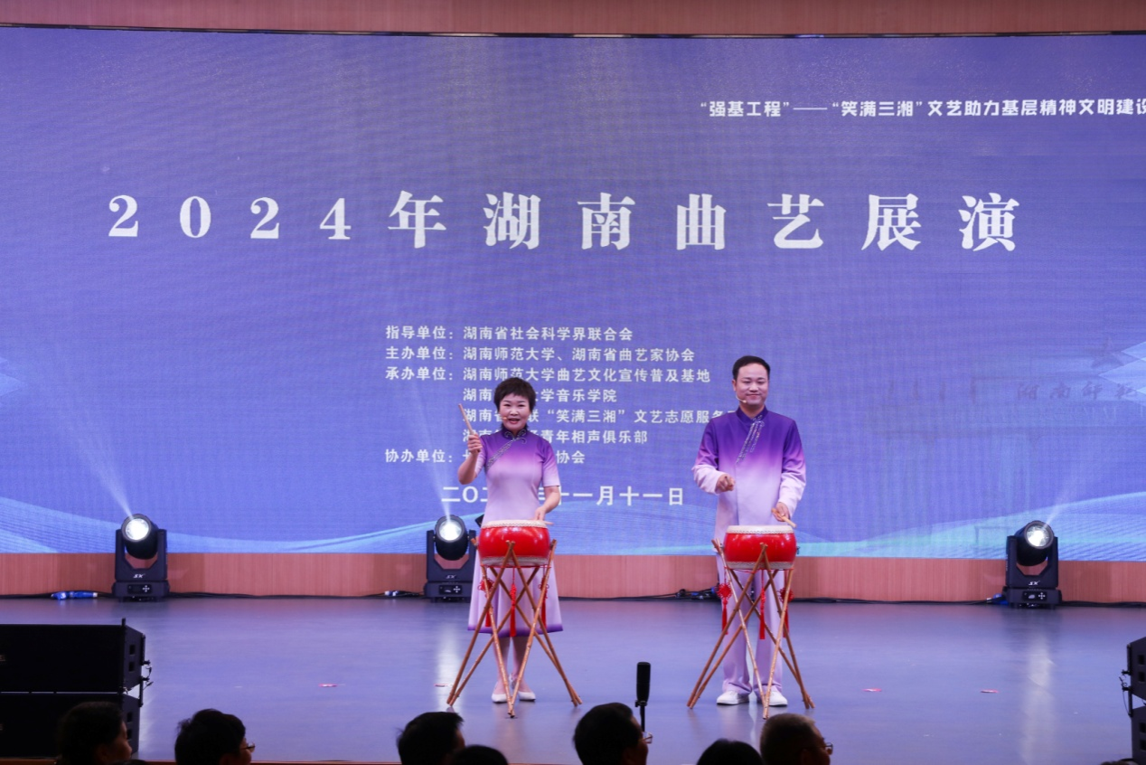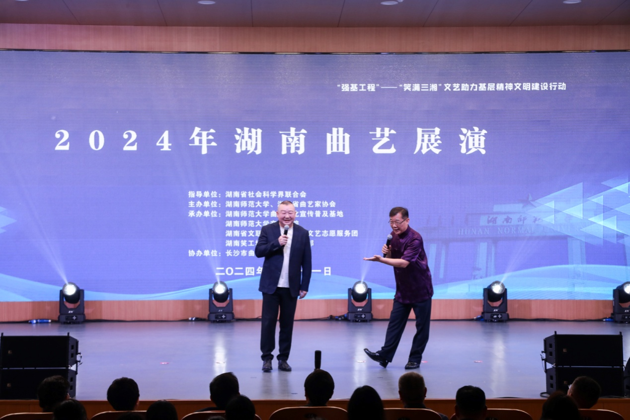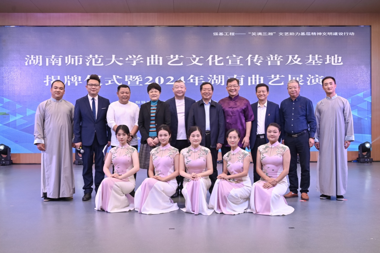 11月11日,湖南省社科普及基地湖南师范大学曲艺文化宣传普及基地揭牌仪式暨2024年湖南曲艺展演在我校音乐学院举行。省社科联党组书记、副主席胡代松,副主席贺建湘,我校党委书记、欧洲科学院院士蒋洪新,党委副书记周俊武出席会议。