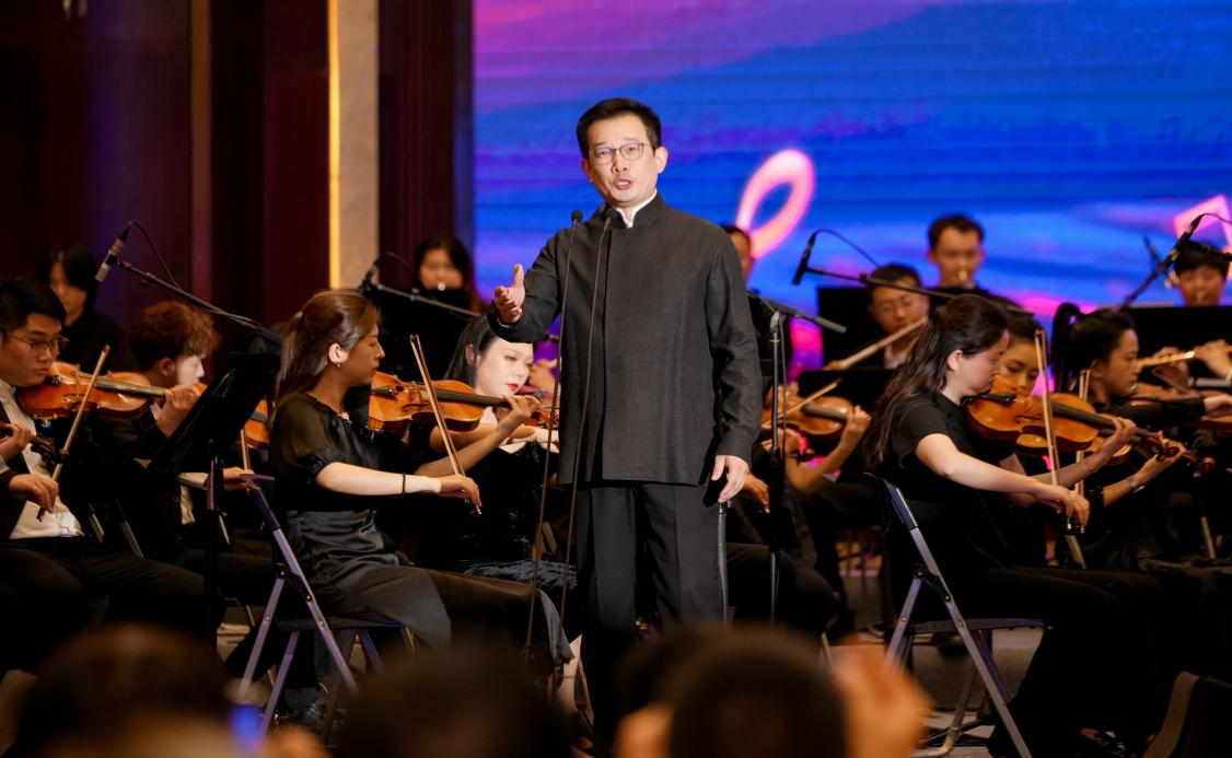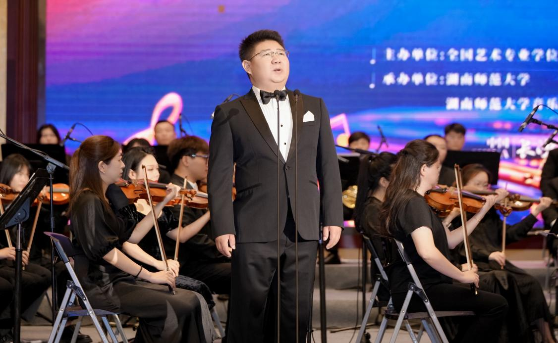 音乐会在学院教授、副院长石倚洁的男声独唱《我爱你中国》中推向高潮。这首经典作品以炽热的情感抒发了对祖国的无限热爱与赞美。石倚洁作为著名男高音歌唱家,以其高亢激昂的嗓音和极富感染力的舞台表现,将对祖国的深情厚谊融入每一个音符,引发全场共鸣,掌声经久不息。本场音乐会以高水平的艺术呈现赢得与会来宾的高度赞誉,充分展现了湖南师范大学音乐学院在师资力量、创作实践与艺术展演方面的卓越实力,为会议增添了浓墨重彩的艺术篇章。