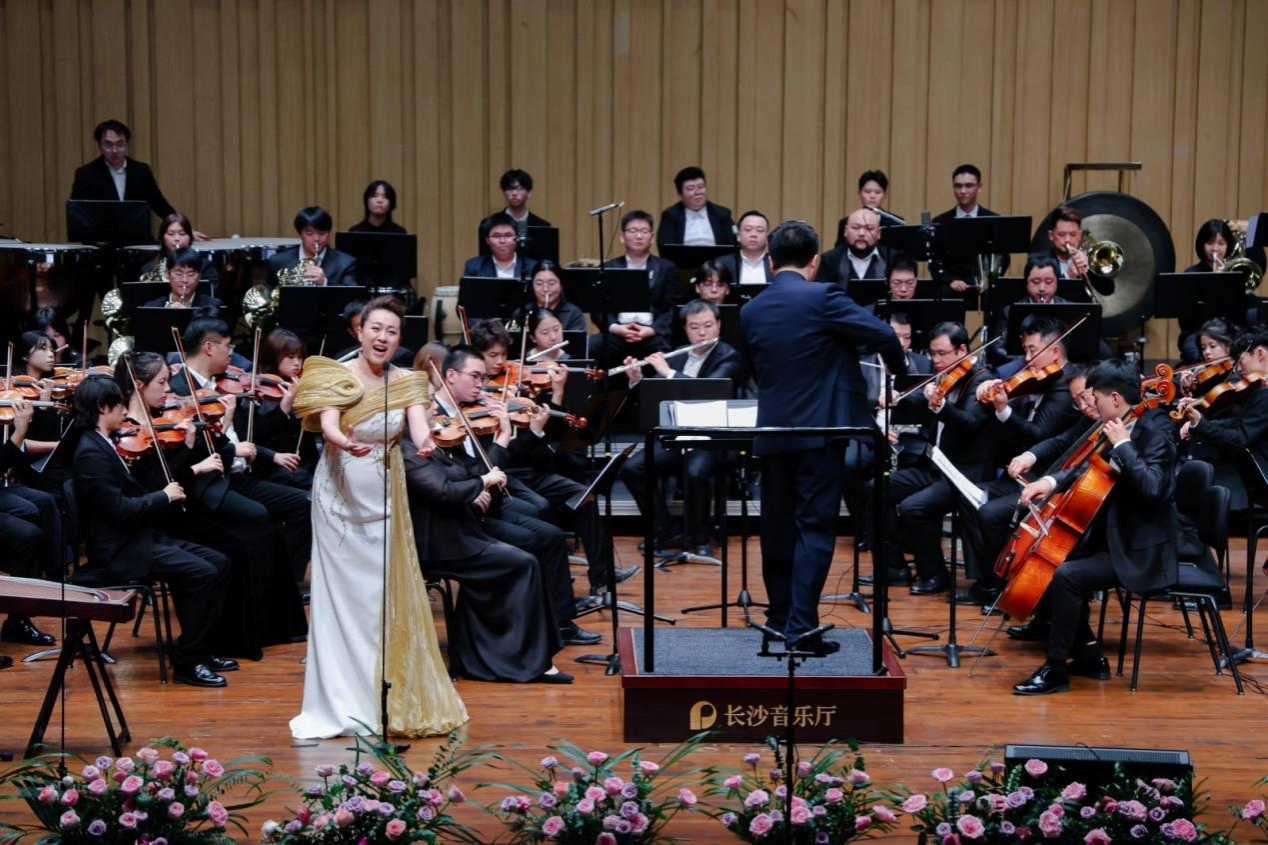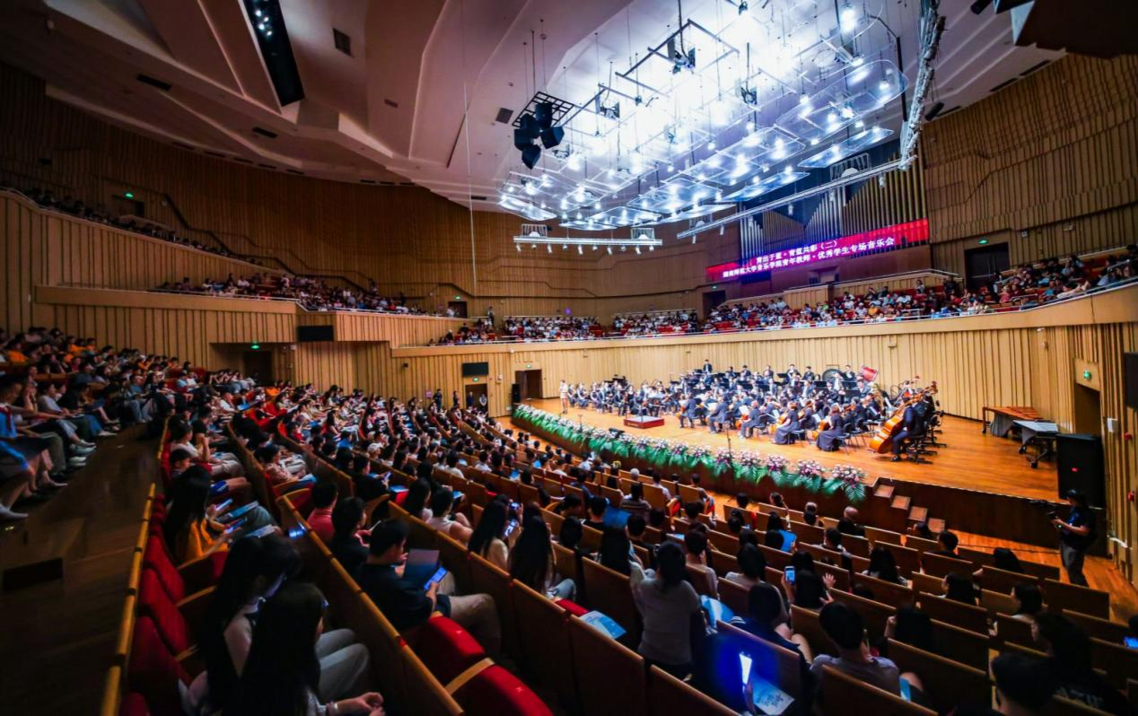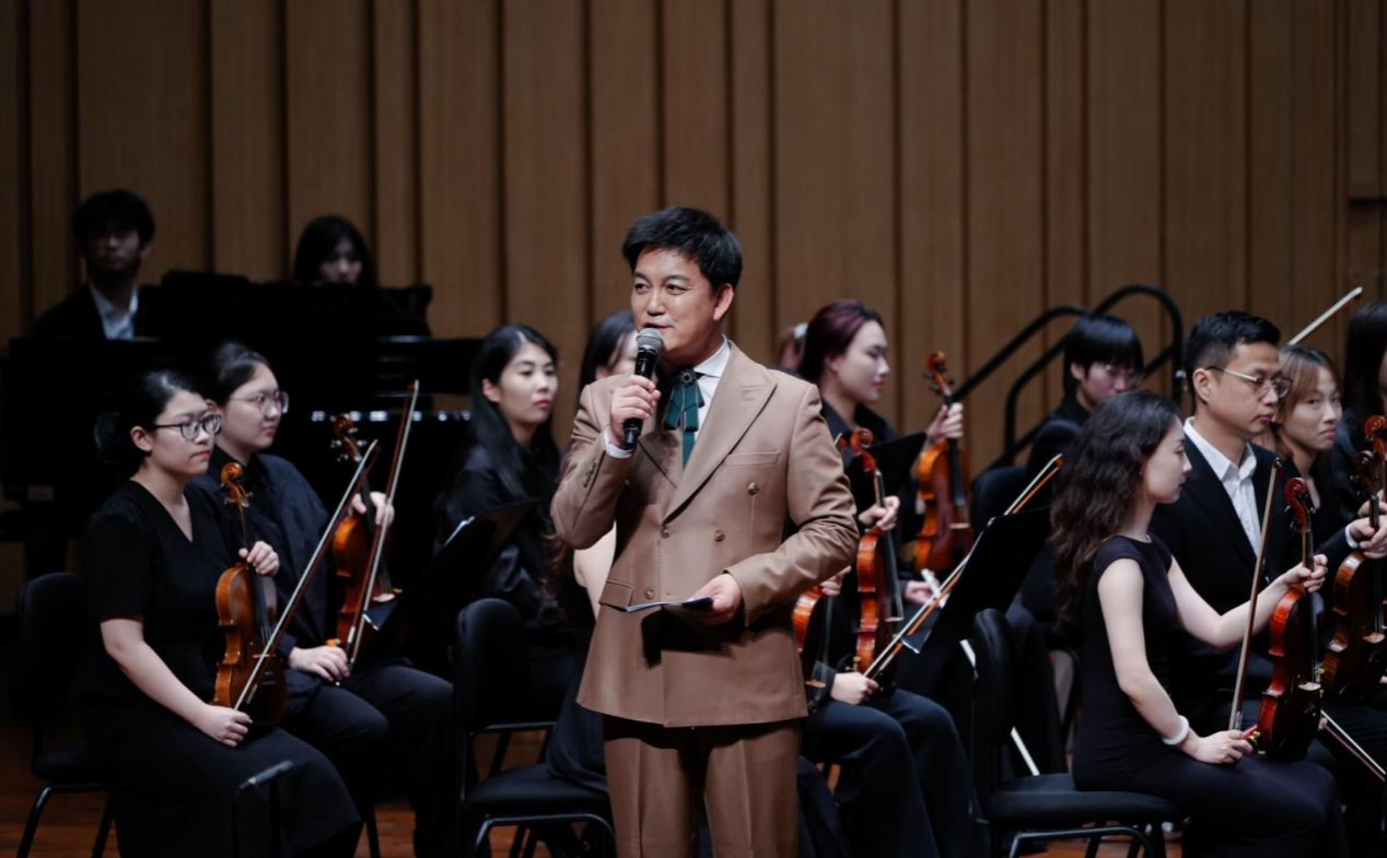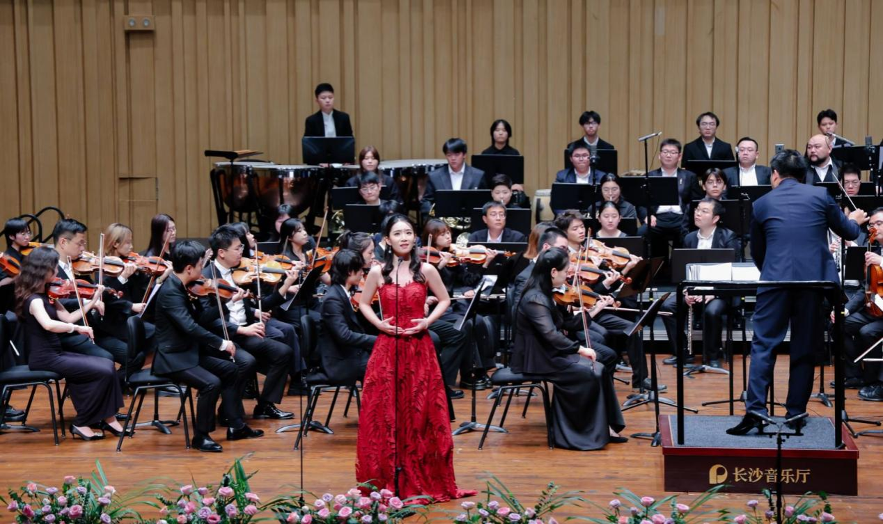 音乐会在潇湘爱乐交响乐团充满浓郁湖南味道的管弦乐《花鼓抒怀》中拉开帷幕。作品由音乐学院院长廖勇教授创作,将湖南花鼓戏的灵魂旋律和独特元素融入交响语境,彰显了厚重的地域文化底蕴。随后,青年教师王艺璇、博士生曲丹分别演唱了《岳麓书院》《高山流水》,显示出金钟奖实力的完美唱功。青年教师王文洁、陈薪竹、彭帅理、陈浩然合作的器乐合奏《Tico Tico》节奏明快,嗨翻全场。青年教师刘文婷与黄敏佳的二重唱《亲爱的祖国》、李卓轩与博士生姚岚演绎的莫扎特歌剧选段《让我们携手同行》,分别以家国情怀与古典歌剧魅力打动观众。青年教师周末表演的钢琴协奏曲《保卫黄河》激昂慷慨,奏响民族精神强音,传达出音乐巨大的号召力量。
