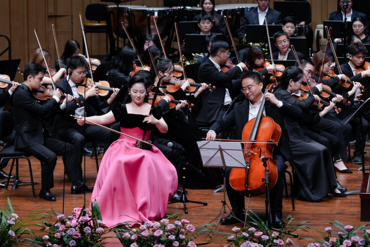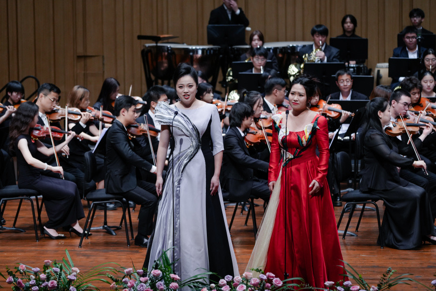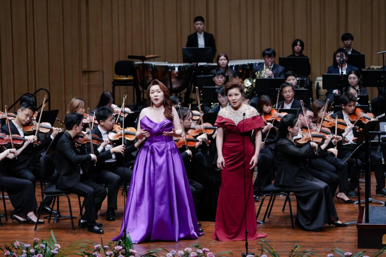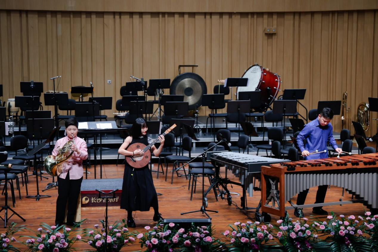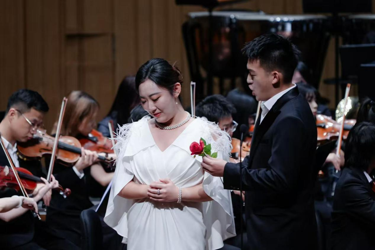 音乐会在潇湘爱乐交响乐团充满浓郁湖南味道的管弦乐《花鼓抒怀》中拉开帷幕。作品由音乐学院院长廖勇教授创作,将湖南花鼓戏的灵魂旋律和独特元素融入交响语境,彰显了厚重的地域文化底蕴。随后,青年教师王艺璇、博士生曲丹分别演唱了《岳麓书院》《高山流水》,显示出金钟奖实力的完美唱功。青年教师王文洁、陈薪竹、彭帅理、陈浩然合作的器乐合奏《Tico Tico》节奏明快,嗨翻全场。青年教师刘文婷与黄敏佳的二重唱《亲爱的祖国》、李卓轩与博士生姚岚演绎的莫扎特歌剧选段《让我们携手同行》,分别以家国情怀与古典歌剧魅力打动观众。青年教师周末表演的钢琴协奏曲《保卫黄河》激昂慷慨,奏响民族精神强音,传达出音乐巨大的号召力量。