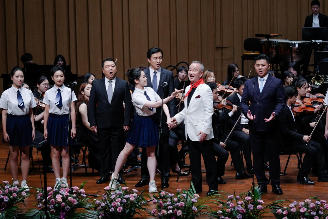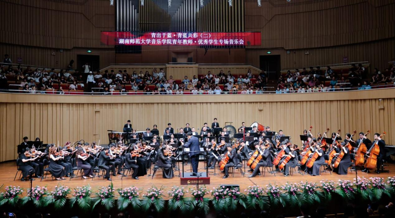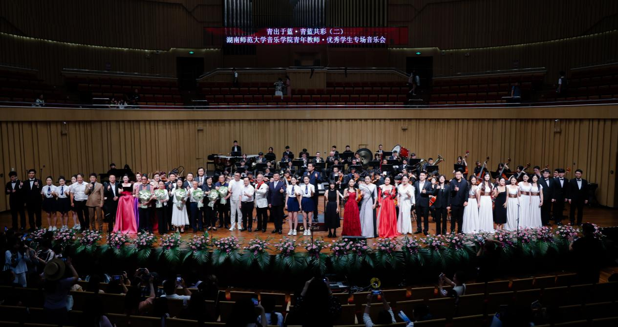 音乐会在欢乐而热烈的气氛中圆满落幕,青蓝故事却依然延续。正如主持人李锐所说,“青蓝共彩”是本场音乐会的主题,更是湖南师范大学70余年教书育人理念的生动表达,也是湖南师大音乐学院始终秉持的人才培养理念。自1942年创办音乐学专业起,学院始终坚守“立德树人”根本任务,构建起“学、练、创、演、赛”一体化实践育人体系,从这里走出了李谷一、王佑贵、陈思思等知名艺术家,更向省内外输送数以万计优秀音乐教育人才,成为推动我国音乐教育事业发展的重要力量。本场音乐会主题中,“青”代表在教师指引下崭露头角的优秀学子,他们在课堂汲取知识养分,在实践中锤炼专业技艺;“蓝”象征深耕教坛、潜心育人的教师群体,他们以扎实专业积淀为学子引路,以满腔育人热忱为成长护航。师生携手登台,既是艺术技艺的代际传承,更是教育精神的接力传递,让“教学相长”的理念在教师节的特殊氛围中落地生根,成为献给教师群体的独特礼赞。