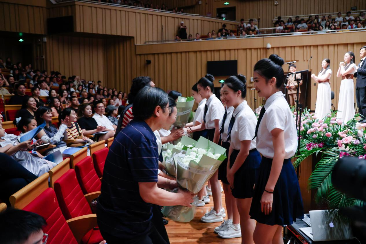 仪式之后,精彩继续上演。廖勇创作的电影音乐组曲《影•响》展现了中西影视音乐创作的碰撞融合。著名小提琴演奏家、学院教授柴亮执弓演绎学院名誉院长赵季平的《第一小提琴协奏曲》,以细腻琴音诠释大师作品的深厚内涵。青年教师钱树林深情演绎《美丽时光》,充满新疆音乐风格的表演让人耳目一新。青年教师夏攀与博士生导师陈果教授合作的二胡协奏曲《红梅随想曲》,让民族乐器的悠扬与大提琴的浑厚相得益彰。青年教师瞿钰洁、谢韵蕾带来的《花之二重唱》,尽显西方歌剧的优雅浪漫。压轴曲目《长大后我就成了你》由虢建武、于洋、谭闻达、谢志怀等老中青三代教师与车心怡、何薇羽等学生共同演绎,师生巧妙改编歌词,学生倾诉“长大后我想成为你”,老师赞誉“长大后你就成了我”,小小改动道尽师范教育的传承初心,让全场情感共鸣达到顶点。