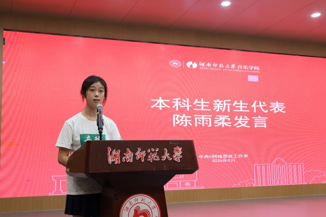 2025级本科新生代表陈雨柔发言。她指出成为音乐人既是荣光也是责任,提出用精进心夯实专业、包容心拓宽视野、同理心传递音乐温度,承诺与新生伙伴以奋斗铸青春,谱写出动人乐章。