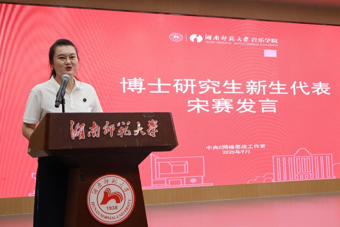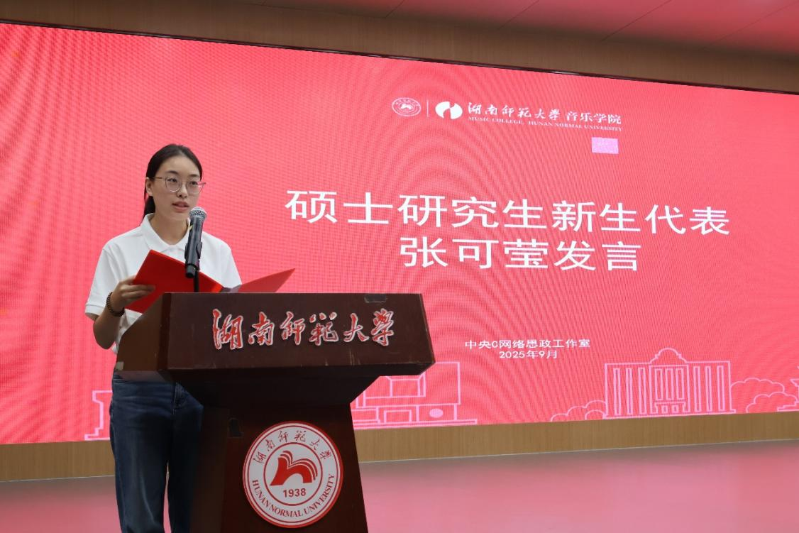 2025级研究生代表张可莹发言。她以“仁爱”“精勤”的校训悟音乐真谛,展望研究生的新生活,期待在导师指导下提升。