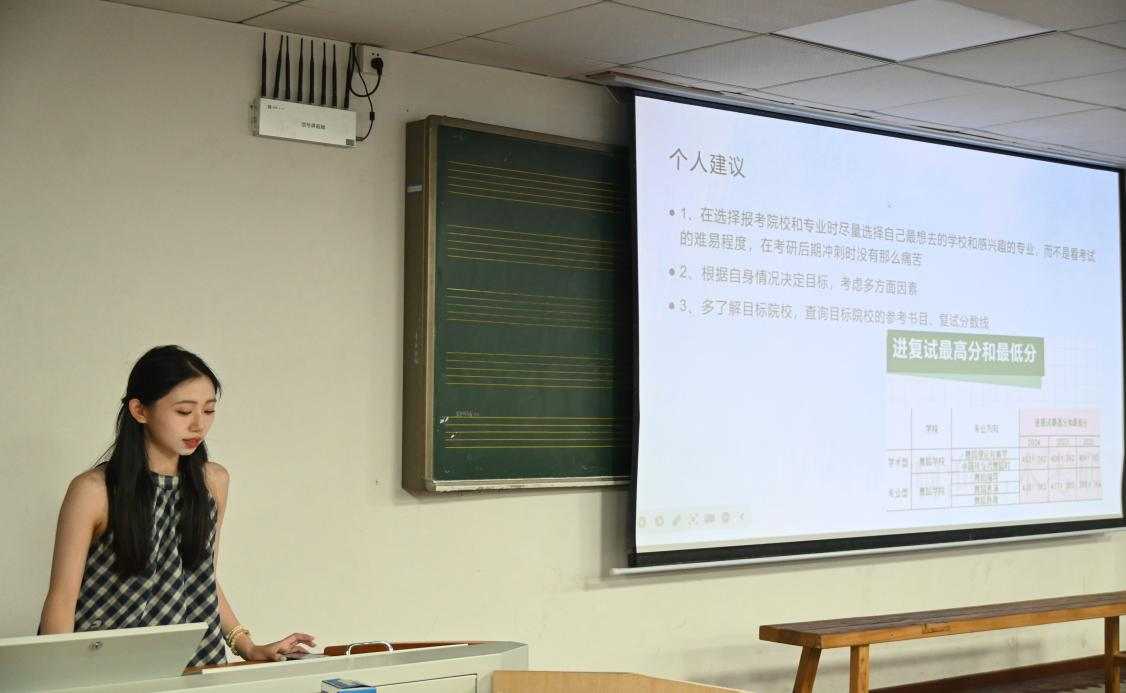 在升学领域,2021级音乐表演专业王劼璐围绕保研流程,细致讲解材料准备、院校选择与面试技巧,鼓励同学“早规划、多积累”;中外合作专业张欣玥分享跨专业考研经验,强调“兴趣驱动”与“韧性坚持”;舞蹈专业赵梓铭同学针对舞蹈类考研,提出平衡专业技能与学术素养的备考策略。就业领域,音乐表演专业丁毓强分享求职实战技巧,鼓励主动积累实习经验;音乐学专业曾捷则围绕公务员考试,传授备考策略与心态调整方法。