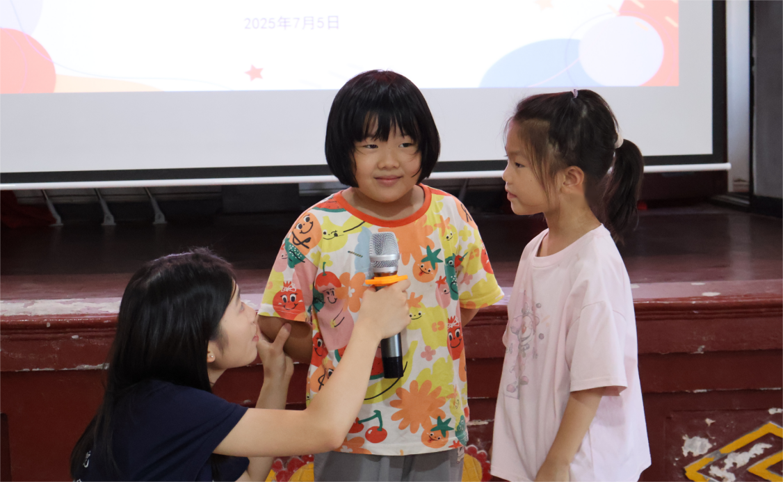 师生见面会环节,实践团成员带来的歌伴舞表演《小美满》引得现场掌声不断。在老师的感染下,孩子们纷纷登台自我介绍并进行才艺展示,实践团成员认真欣赏,并给予细致点评与鼓励,现场互动频繁,欢笑不断。