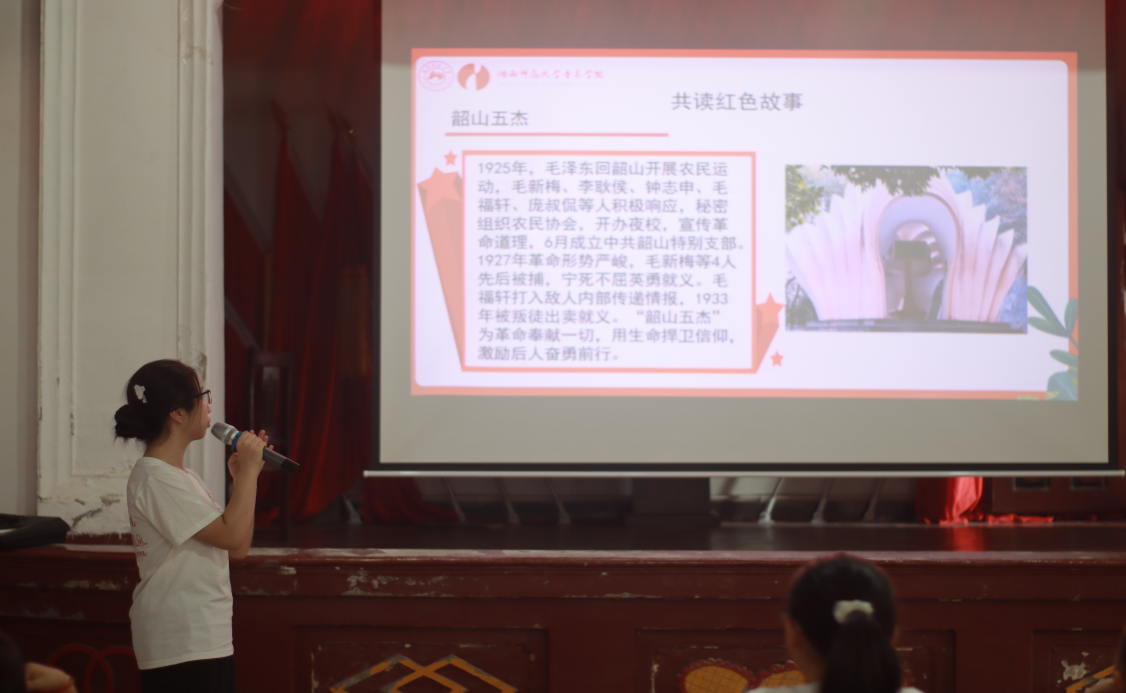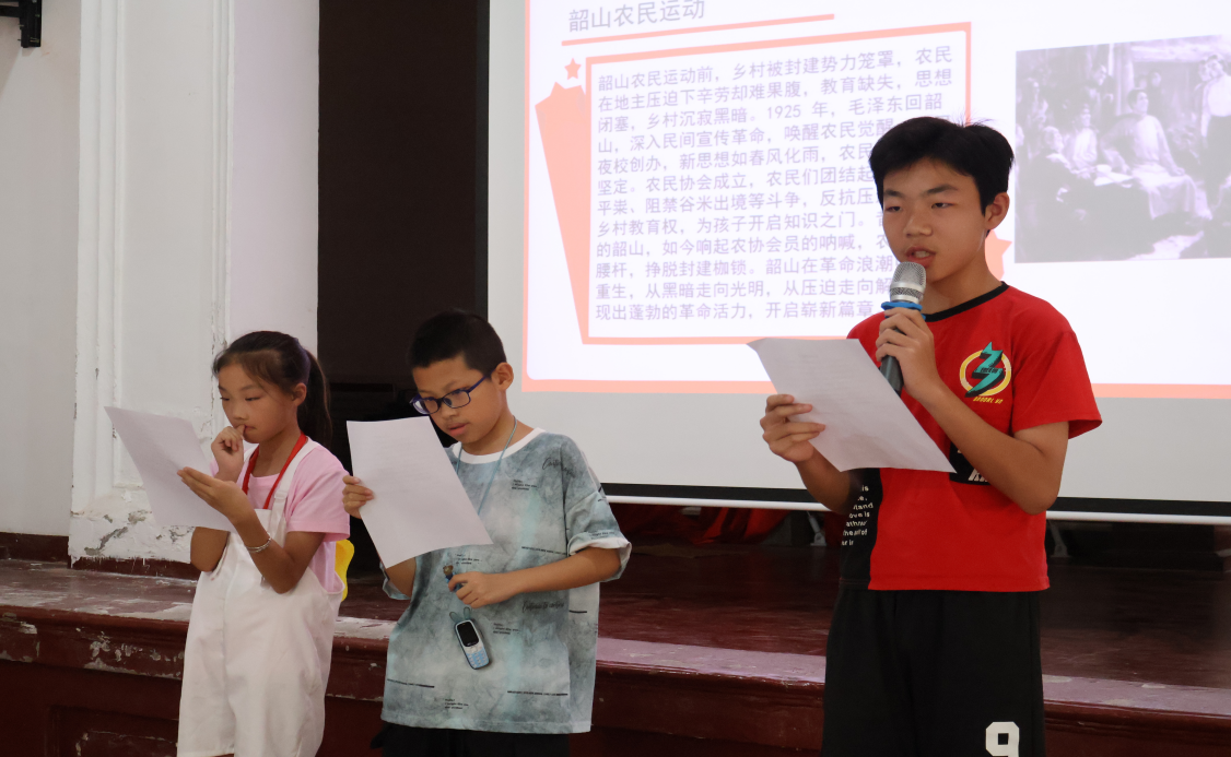 活动伊始,实践团成员魏子瑄、费亦涵、赵子怡依次讲述了三个韶山的经典红色故事。从“韶山五杰”抛头颅、洒热血的英勇事迹,到毛泽东主席一件睡衣承载的朴素作风与为民初心,再到波澜壮阔的韶山农民运动历程,主讲人以细腻生动的语言,将历史场景娓娓道来,让在场的孩子们深刻感受韶山这片红色沃土的厚重底蕴。在每个故事讲述完后,实践团成员都会现场邀请孩子进行故事朗诵。孩子们用坚定的声音,传递着对革命先辈的崇敬,诵读声铿锵有力,回荡在活动现场。