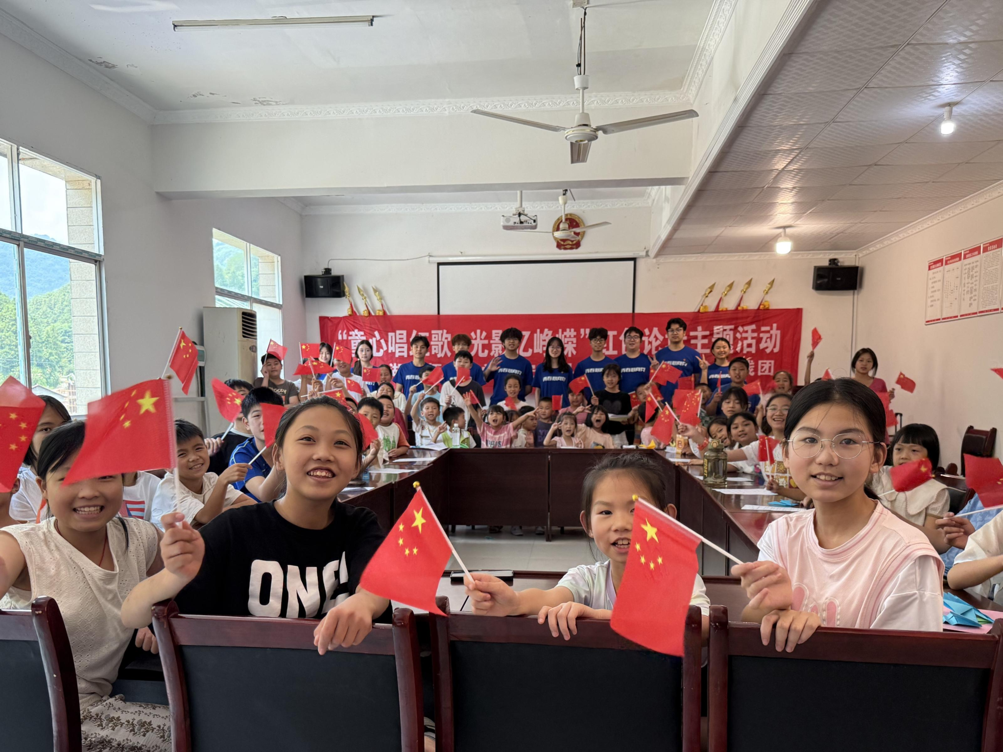 图为孩子们热情挥舞小红旗