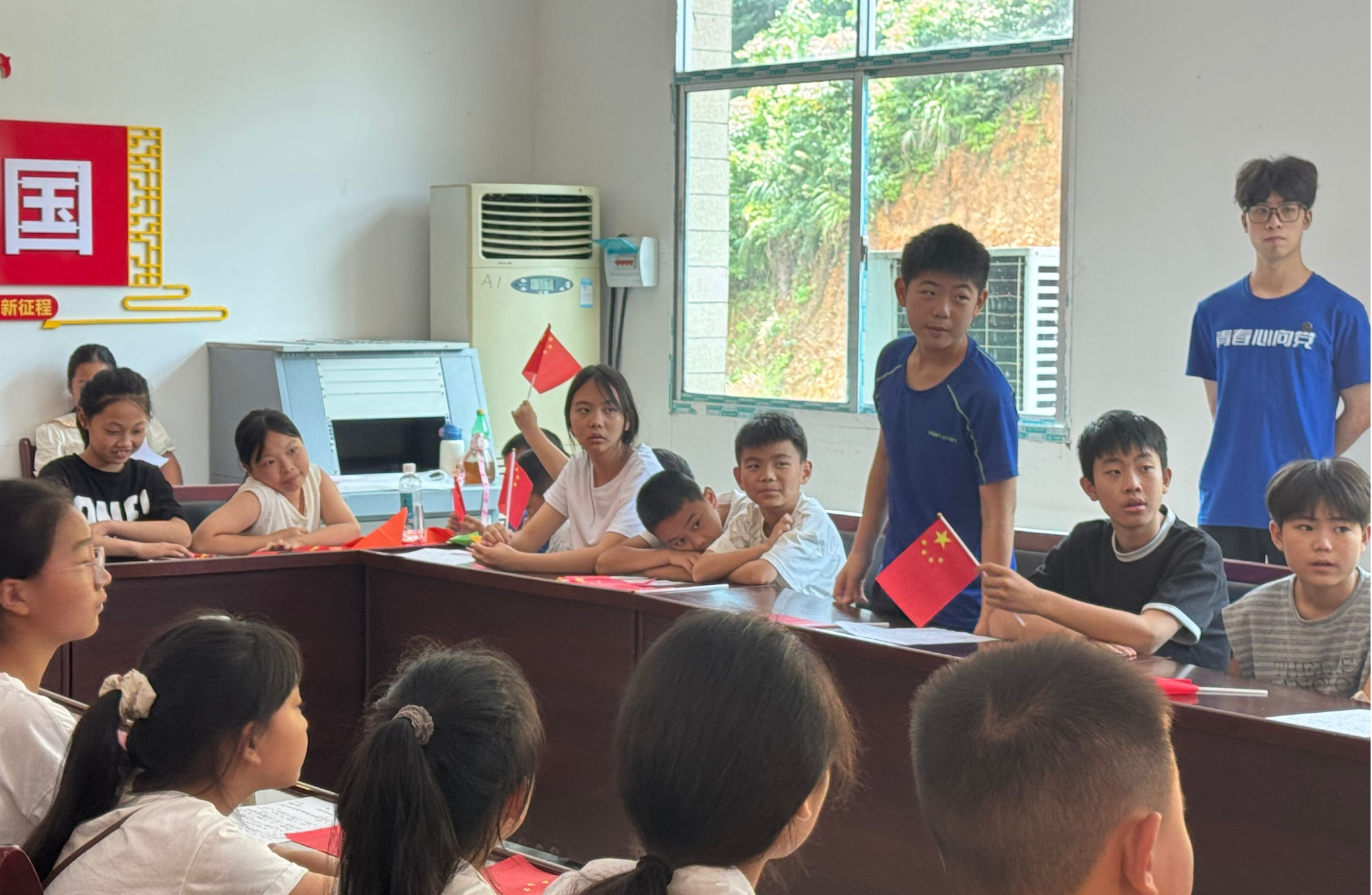 活动以“童心唱红歌,光影忆峥嵘”为主题。主要分为两个板块,第一个板块是讲好党史故事,实践团成员通过生动有趣的讲述,将党的光辉历程呈现在孩子们眼前;第二个板块是铭记抗日历史,让孩子们深刻了解那段艰苦卓绝的岁月。板块与板块之间还穿插了对革命歌曲的介绍与赏析,当实践团成员领唱《红星歌》时,孩子们纷纷认真聆听,小声跟唱,手中的小红旗随着音乐节奏挥舞,仿佛置身于那段激情燃烧的岁月,真切感受着音乐中蕴含的强大力量。