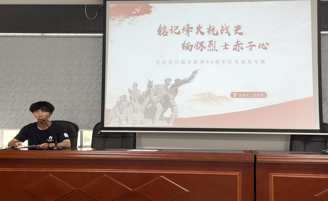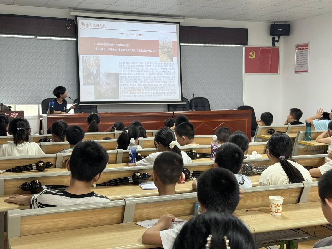 活动伊始,主讲人采用观看视频的方式,让孩子们对中国人民抗日战争有了一个基本的了解,为同学们深刻理解红色历史筑牢了基础;随后,主讲人采用师生互动提问以及讲故事的方式介绍了抗日战争的发展历程,从1931年九一八事变到1945年八一五日本投降,从局部抗战到全民族抗战的史料还原历史真相,还以七七事变、南京大屠杀、淞沪会战等典型事件,全面系统地展示了中国人民在14年浴血奋战的抗战历程中所铸就的“中华民族永不屈服”的坚定信念与抗争精神。活动尾声,实践团成员共同演唱歌曲《灯火里的中国》。深情的歌声回荡在现场,每一句旋律都承载着对革命先辈的缅怀,每一个音符都传递着对红色精神的传承,展现出新时代青年对祖国的赤诚与时代担当。