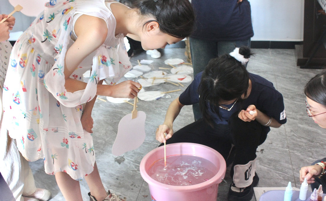 实践团成员帮助孩子制作漆扇