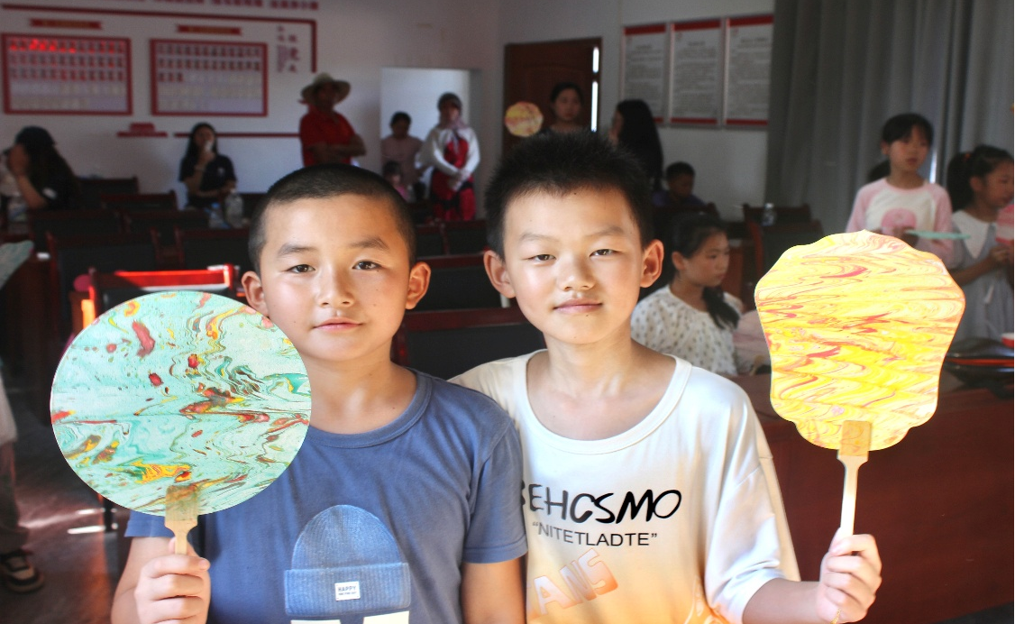 制作完成后,实践团成员组织孩子们展示各自创作的独特漆扇作品,引导儿童阐述创作构思,并评选出奖项,鼓励大家将亲手制作的、承载传统文化的漆扇作品带回家中与家人分享。此次活动将知识与实践紧密结合,既锻炼了孩子们的动手能力,又让他们在亲身体验中增进了对传统文化的认知与热爱。