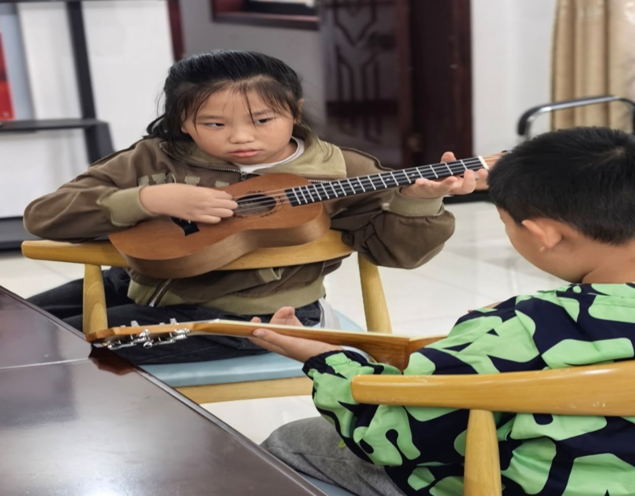 本次课程中,志愿者们先带领小朋友复习和弦知识并开展和弦连接练习,帮助大家筑牢音乐理论基础;随后,志愿者们系统讲解常用拨弦方法,指导小朋友们进行曲目的演奏练习,让大家在实践中稳步提升演奏技巧。课堂上,孩子们带着十足的热情大胆尝试、勤加练习,从生疏摸索到熟练掌握和弦连接技巧,成功让一串串和谐动听的旋律在指尖流淌。