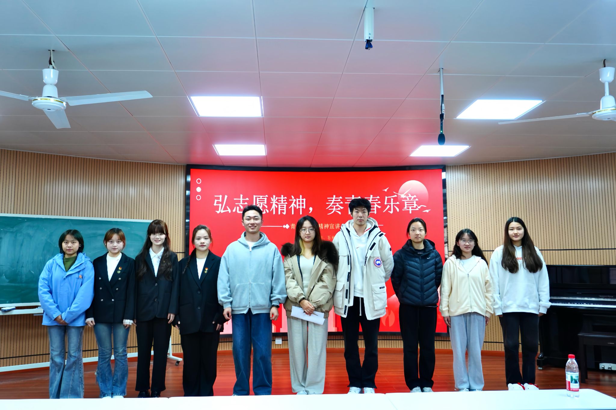 (通讯员 唐安雅 陈潇江 )为深入学习贯彻党的二十大精神,大力弘扬“奉献、友爱、互助、进步”的志愿精神,激发广大青年的责任担当与服务热情,2025年12月3日上午,湖南师范大学音乐学院开展了一场以“弘志愿精神,奏青春乐章”为主题的青年志愿者精神宣讲会。音乐学院党委书记王铁钢、学院党委副书记牟洋出席,学院团委书记、2022级本科辅导员李思达、2023级本科辅导员文佳豪及音乐学院部分学生代表参加。此次活动由唐安雅、石妹爱两位同学任主讲人。