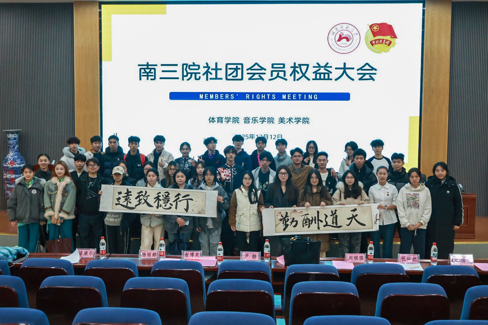(通讯员 廖轩艺 周祺琪 马汇溪)音乐学院、体育学院与美术学院学社管于 2025年12月12日中午12:30在体育学院行健楼二楼多功能报告厅联合举办南三院会员权益大会。校学社管监察部副部长尹静、音乐学院学社管主任廖轩艺、体育学院学社管主任王宁、美术学院学社管主任谢博英参加此次会议,体育学院学社管主任王宁担任主持。