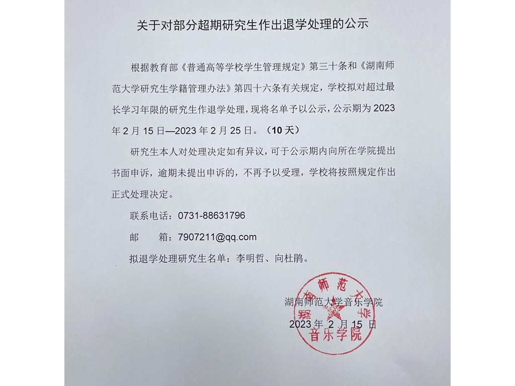 根据教育部《普通高等学校学生管理规定》第三十条和《湖南师范大学研究生学籍管理办法》第四十六条有关规定,学校拟对超过最长学习年限的研究生作退学处理,现将名单予以公示,公示期为2023年2月15日——2023年2月25日。(10天)